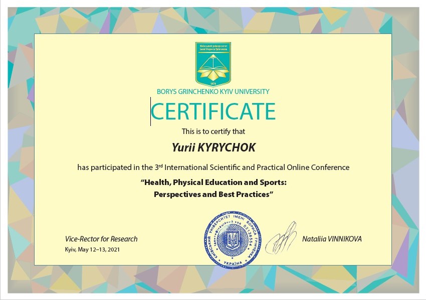 | 447 | Факультет здоров'я, фізичного виховання і спорту | Кафедра спорту та фітнесу | 0 | 0 | 2021 | https://www.researchgate.net/profile/Yurii_Kyrychok |