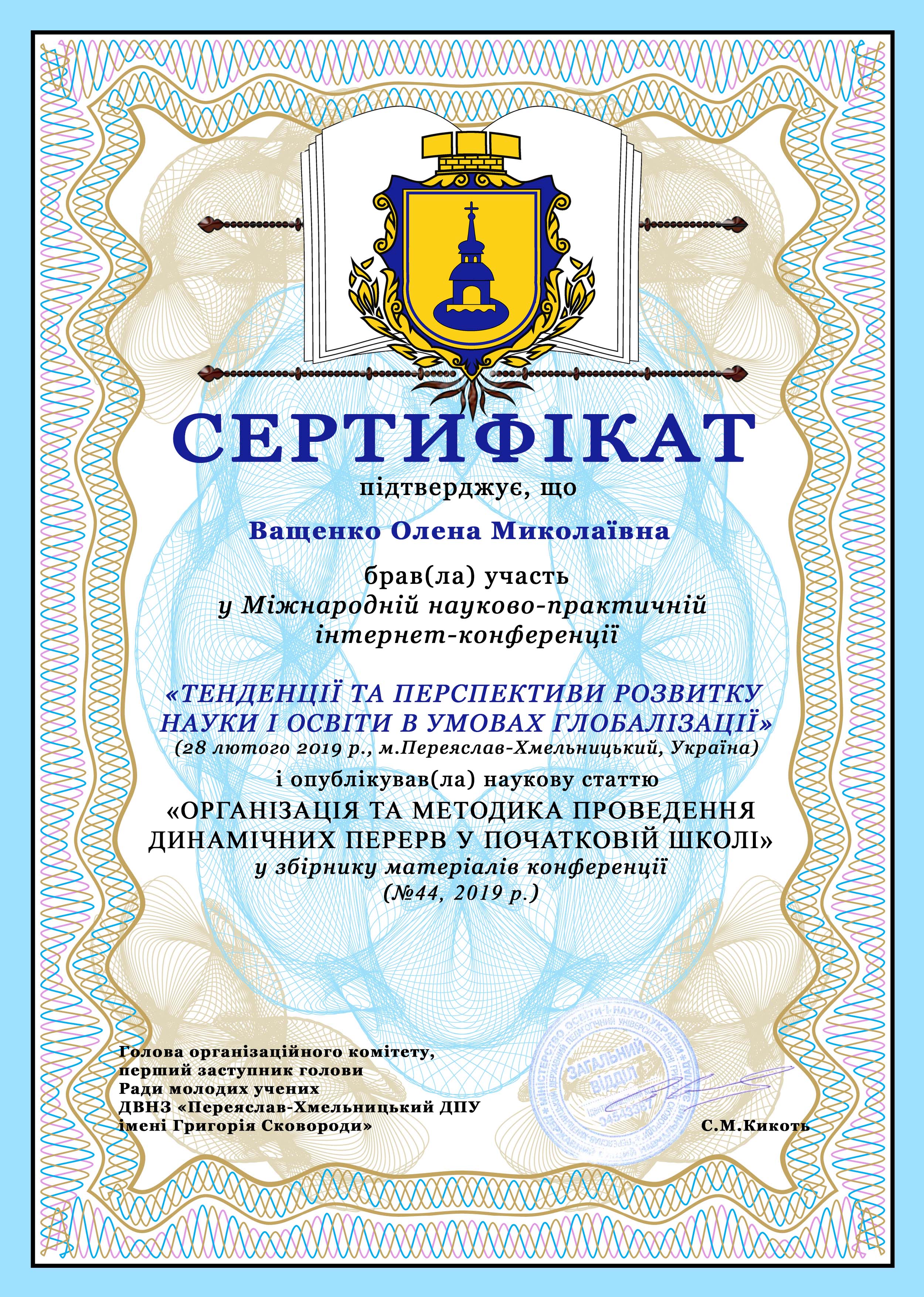 | 4039 | Тенденції та перспективи розвитку науки і освіти в умовах глобалізації | Підготовка майбутнього вчителя до організації здоров'язбережувального освітнього середовища початкової школи | м. Переяслав-Хмельницький |