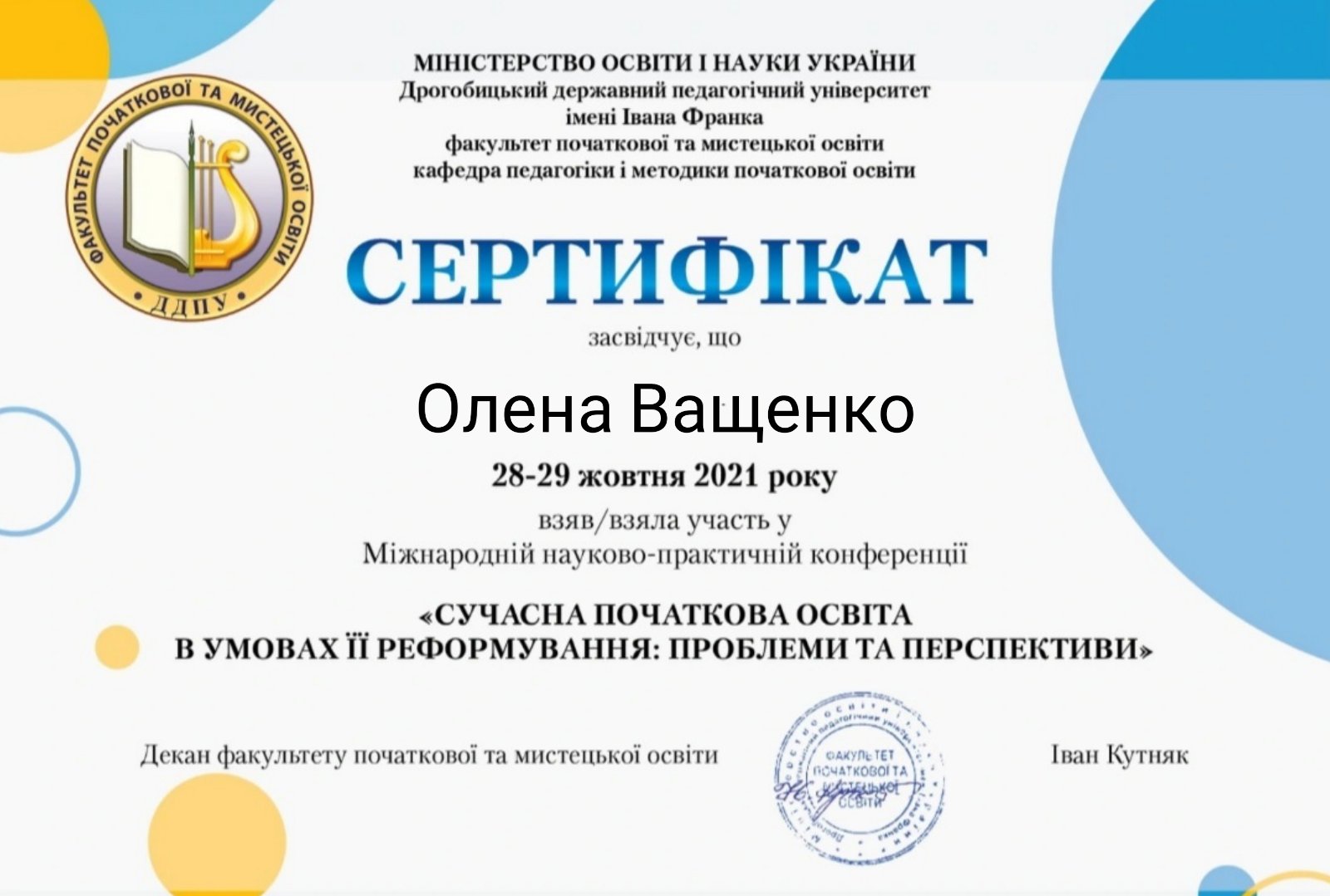 | 1897 | Сучасна початкова освіта: проблеми, теорія та практика | Методичні особливості валеологічного супроводу уроків математики в початковій школі | м. Дрогобич |