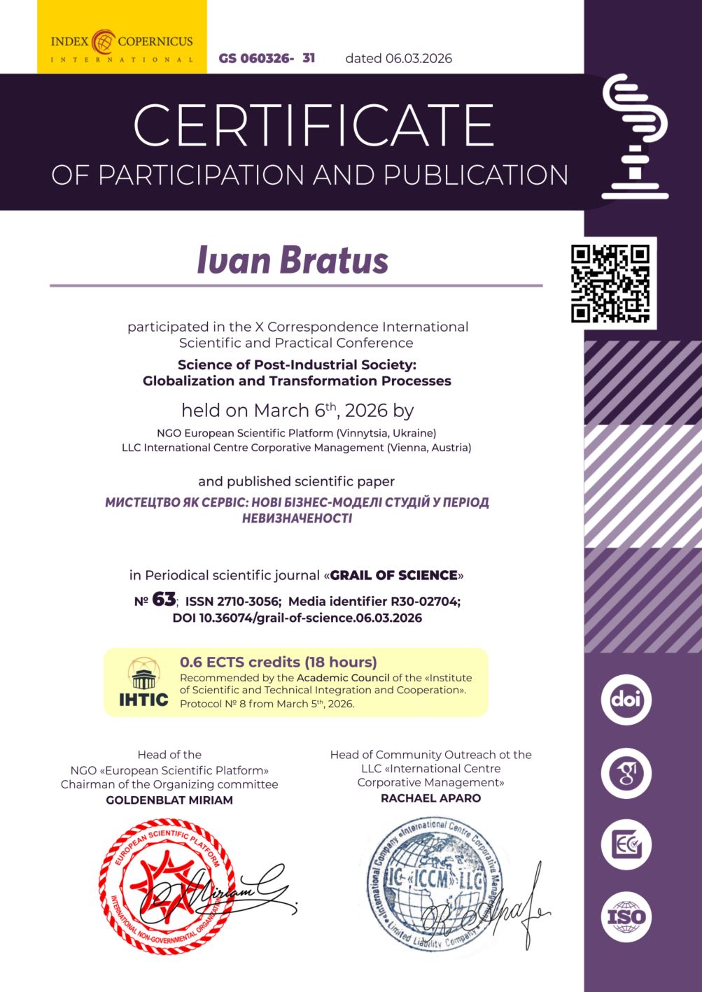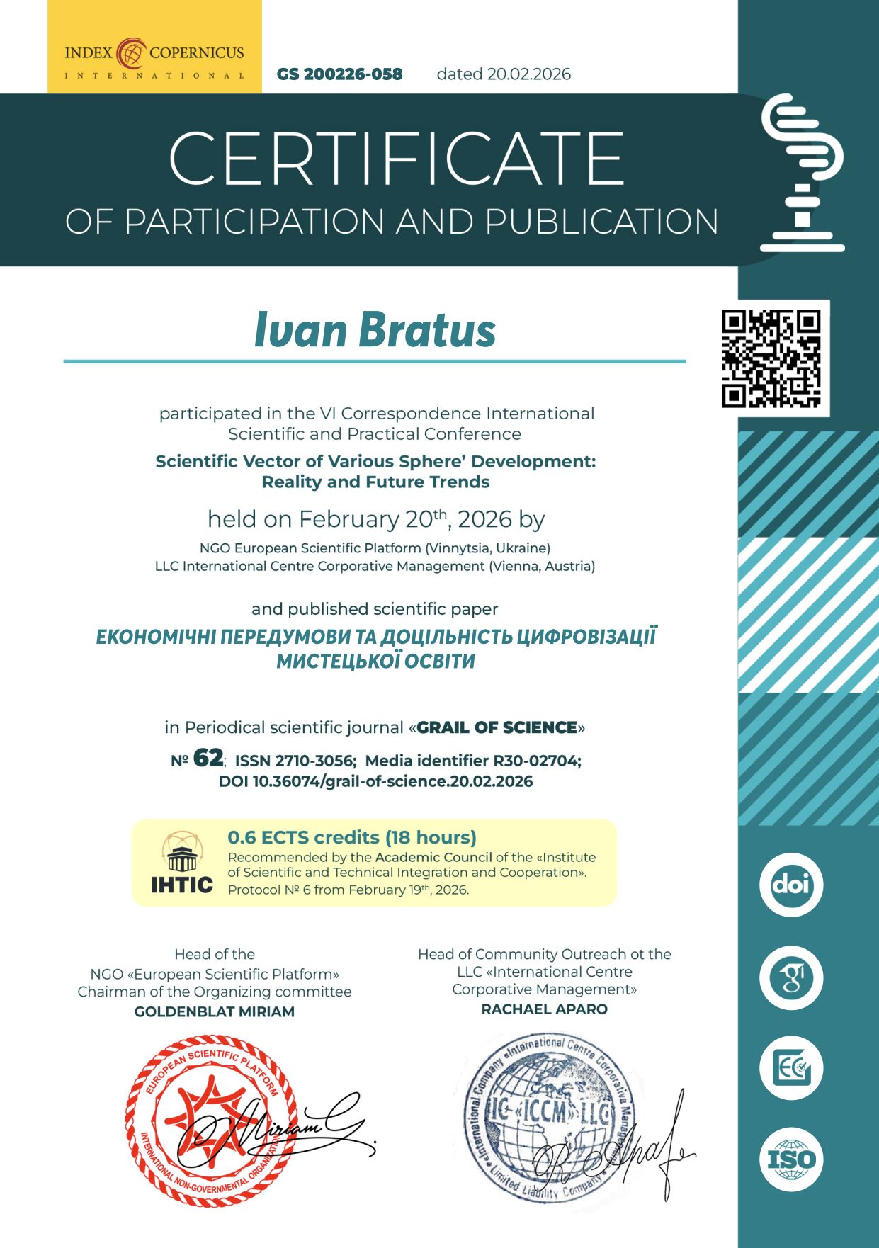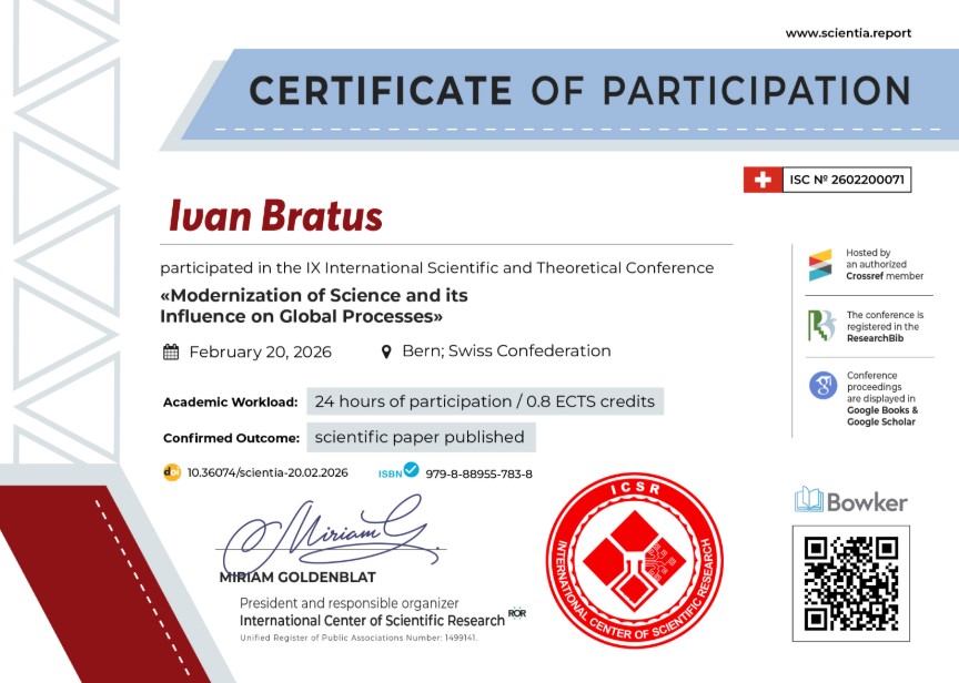 | 13101 | X International Scientific and Theoretical Conference «Theoretical and practical scientific achievements: research and results of their implementation» | THE TWO-TIER CLASSIFICATION SYSTEM OF SCHOLARLY JOURNALS IN UKRAINE: OPPORTUNITIES AND RISKS | February 13, 2026; Liverpool, UK. |