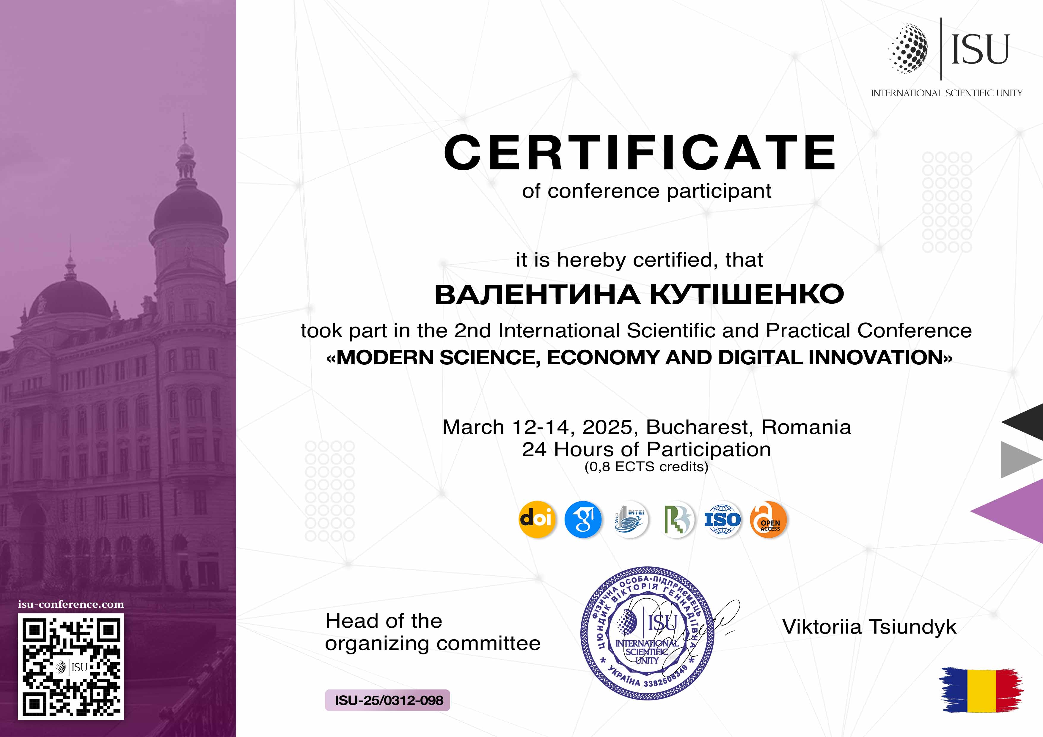 | 12554 | 2 nd International Scientific and Practical Conference "Modern Science Economy and Digital Innovation" | Роль духовних ресурсів педагога під час воєнного стану | Bucharest, Romania |