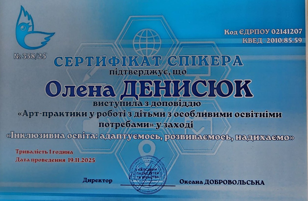 | 12484 | Всеукраїнська конференція «АРТТЕРАПІЯ ЯК РЕСУРС ДЛЯ ПІДТРИМКИ ДІТЕЙ З ООП В ІНКЛЮЗИВНОМУ СЕРЕДОВИЩІ» | Відновлення ресурсів засобами чарівної казки | м. Дніпро | document.pdf | |