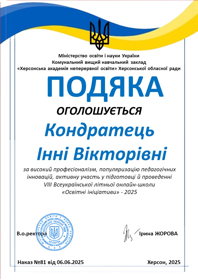 | 12761 | Всеукраїнська літня онлайн-школа «Освітні ініціативи – 2025» | Педагогічний супровід дитячого слововідкриття в умовах тотального білінгвізму українського суспільства | Херсон |