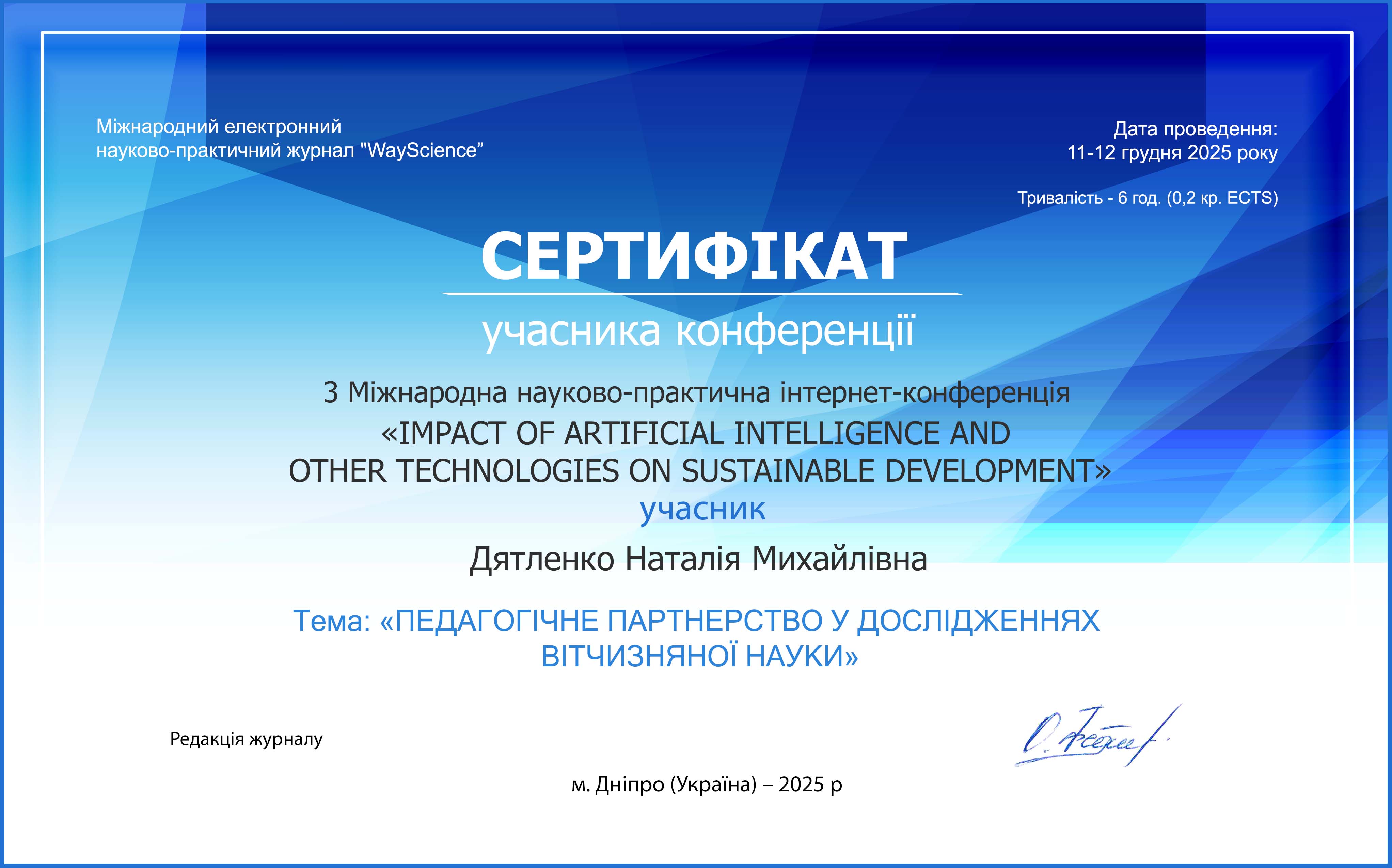 | 13000 | Impact of artifical intelligence and other tehnologiis of sustainable development | Педагогічне партнерство у дослідженнях вітчизняної науки | м. Дніпро |