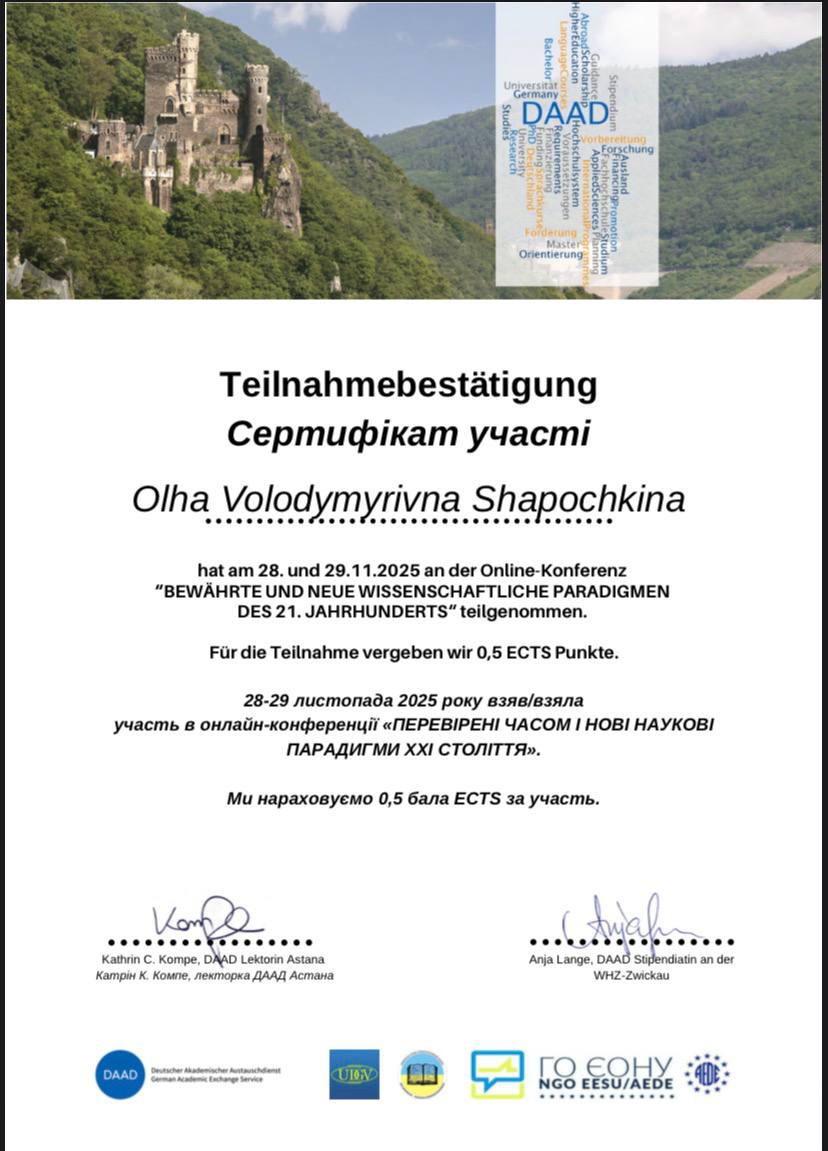 | 911 | Факультет романо-германської філології | Кафедра германської філології | 26.5 | 1 | 2025 | https://www.researchgate.net/profile/Olga-Shapochkina |