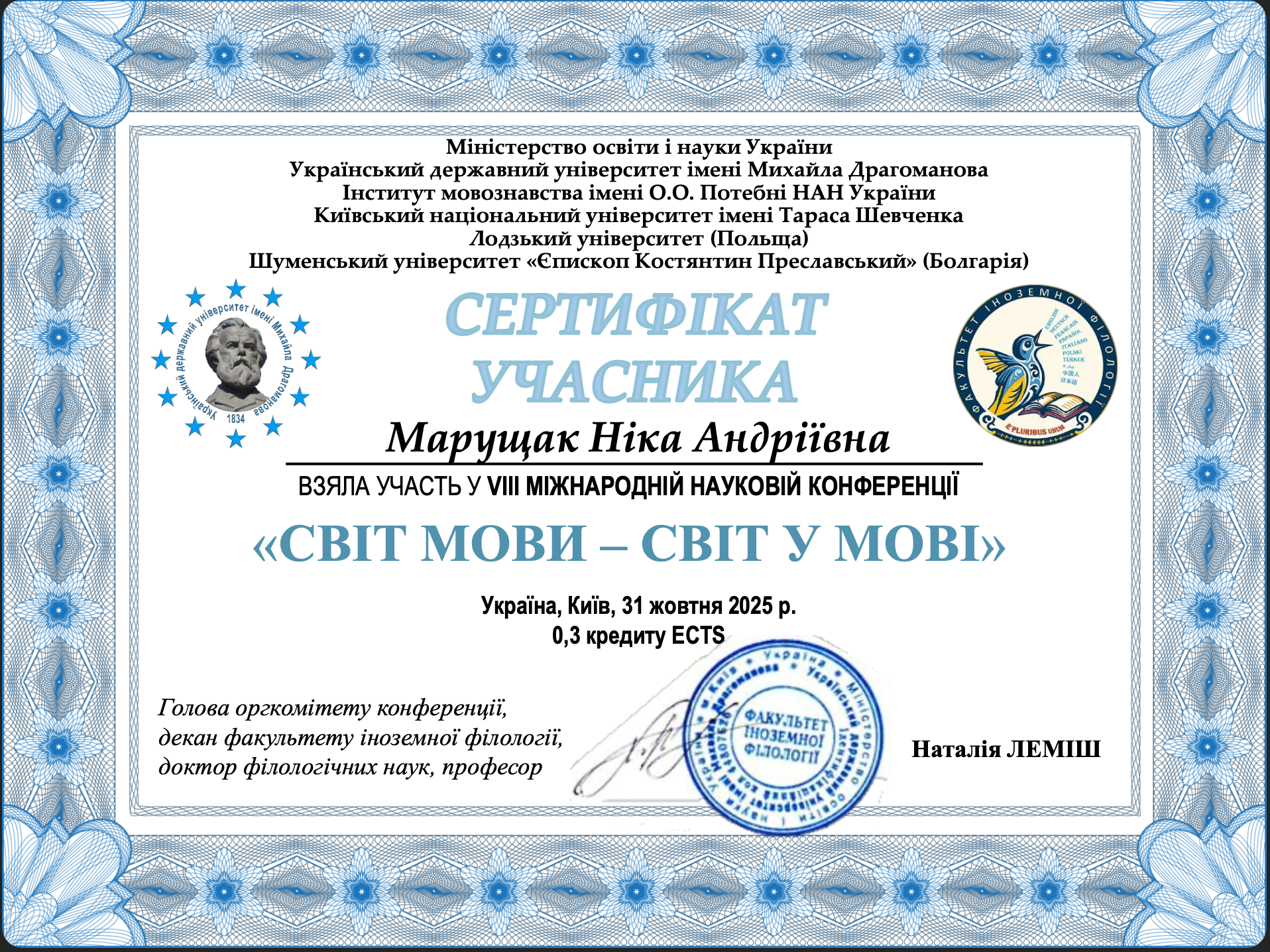 | 353 | Факультет романо-германської філології | Кафедра лінгвістики та перекладу | 27.8 | 0 | 2025 | https://www.researchgate.net/profile/Nika_Marushchak |