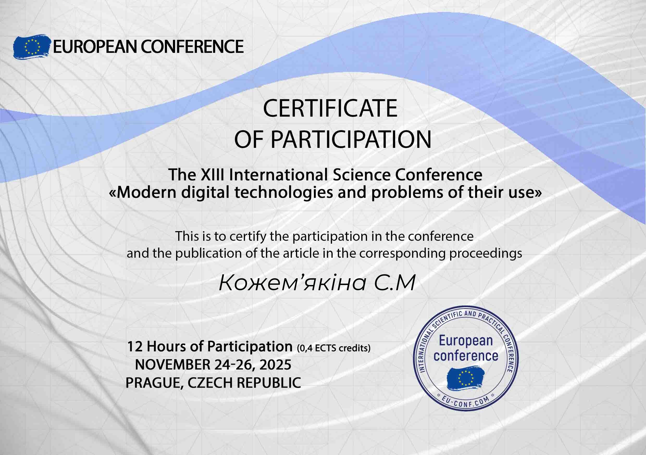 | 12597 | XIII Міжнародна науково-практична конференція «Modern digital technologies and problems of their use» | Шляхи підвищення конкурентоспроможності підприємництва в умовах цифровізації. | Prague, Czech Republic |