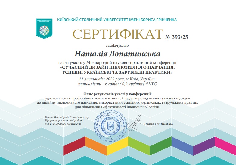 | 12546 | СУЧАСНИЙ ДИЗАЙН ІНКЛЮЗИВНОГО НАВЧАННЯ: УСПІШНІ УКРАЇНСЬКІ ТА ЗАРУБІЖНІ ПРАКТИКИ | Нейропрописи як засіб формування графомоторних навичок у дітей молодшого шкільного віку з особливими освітніми потребами в умовах інклюзивного навчання | м. Київ |