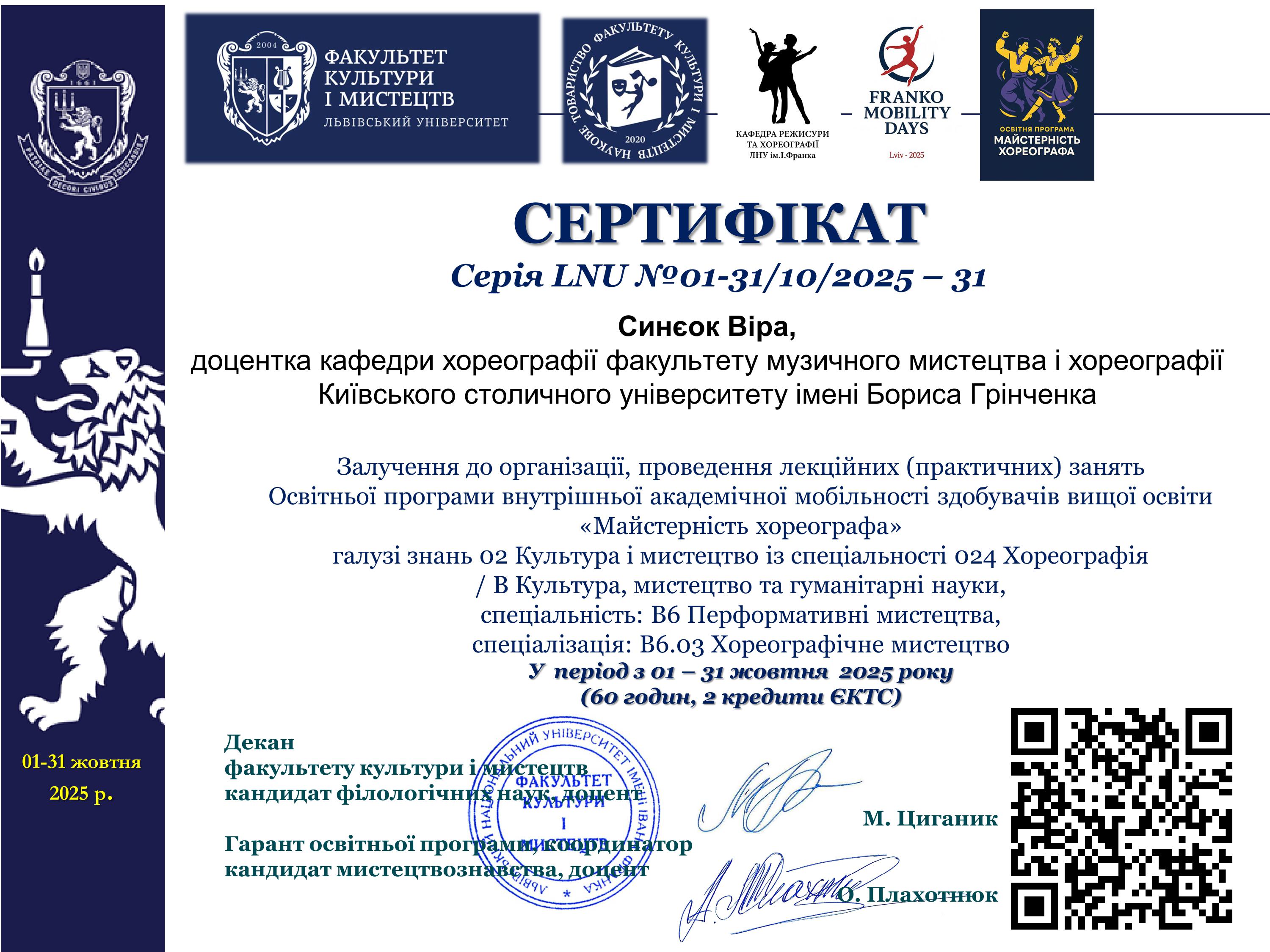| 652 | Факультет музичного мистецтва і хореографії | Кафедра хореографії | 2 | 1 | 2025 | https://www.researchgate.net/profile/Vira-Synieok |