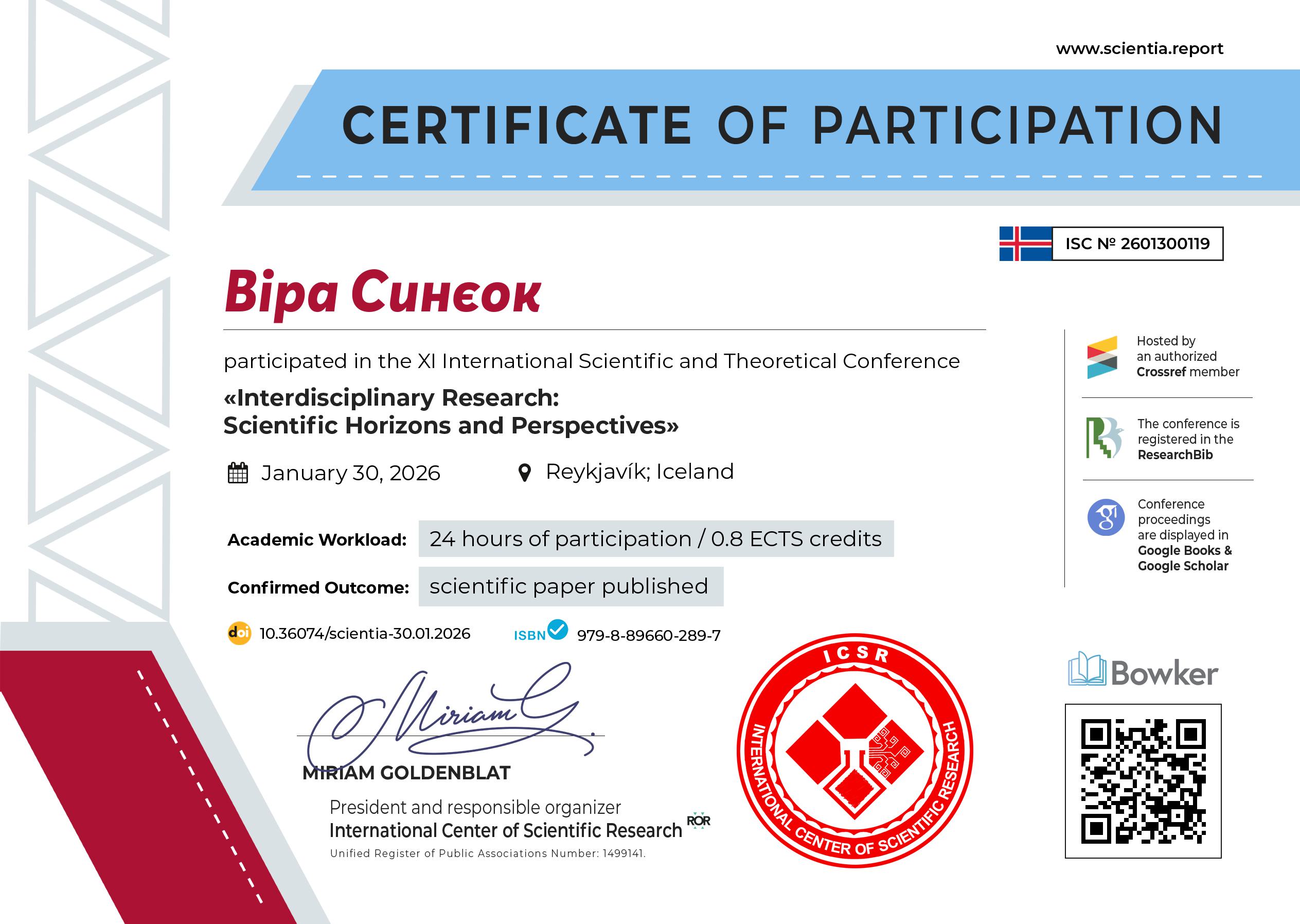 | 13038 | XI Міжнародна науково-теоретична конференція «Interdisciplinary research: scientific horizons and perspectives» | Місце фольклору у навчально-виховній роботі хореографічного колективу | Рейк’явік |