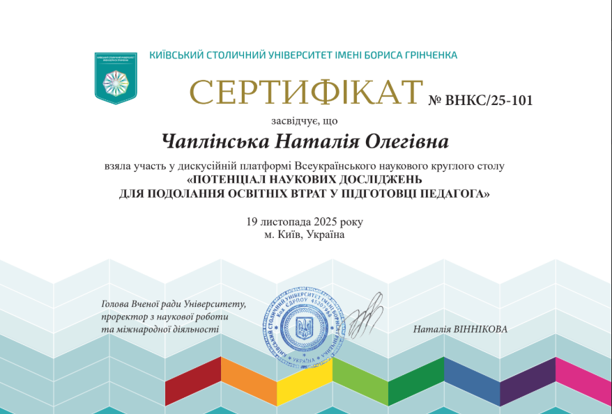 | 997 | Факультет педагогічної освіти | Кафедра іноземних мов і методик їх навчання | 1.3 | 1 | 2024 | https://www.researchgate.net/profile/Nataliia-Chaplinska |