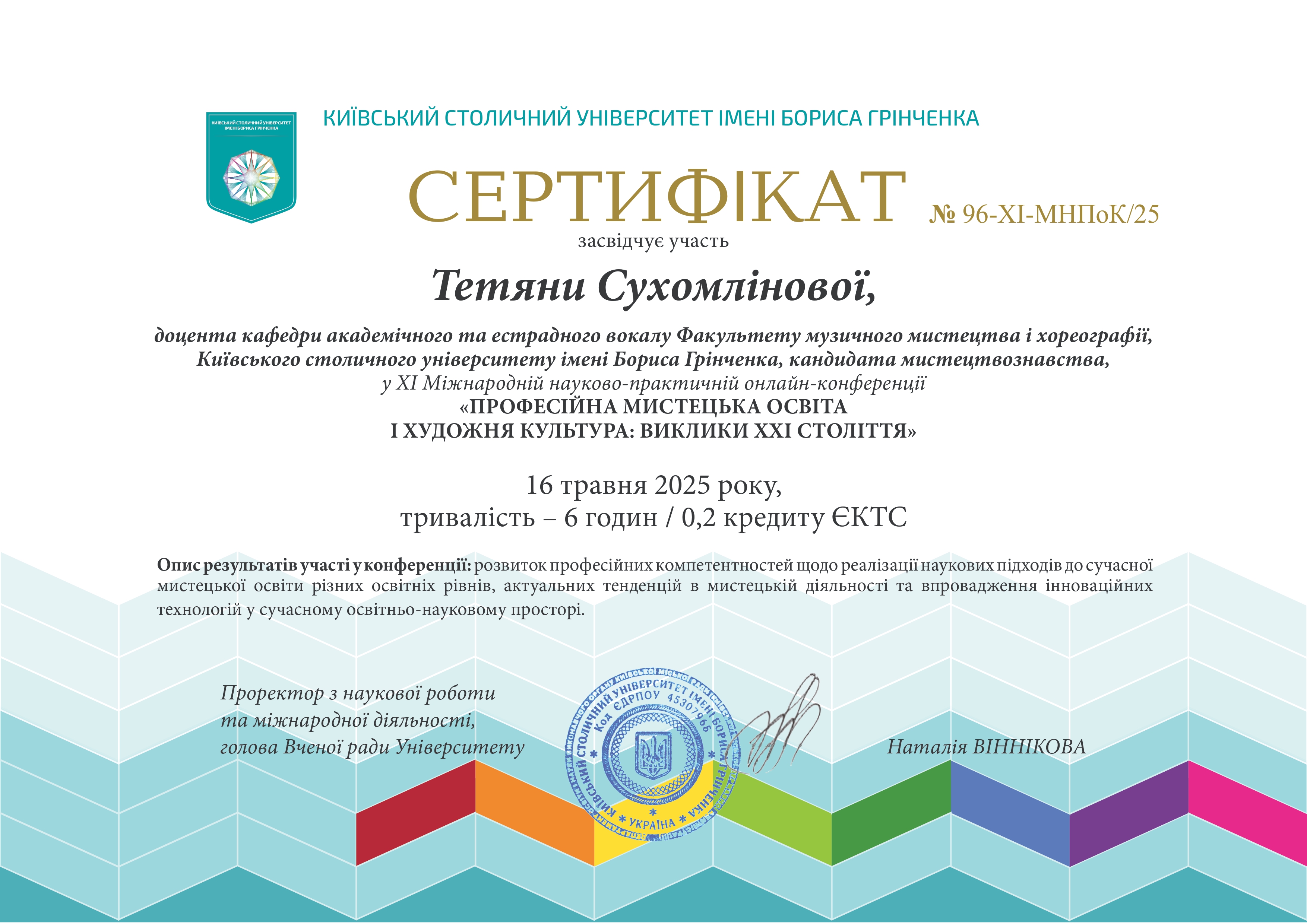 | 86 | Факультет музичного мистецтва і хореографії | Кафедра академічного та естрадного вокалу | Міжнародні конкурси, проведені в Україні | ХХІ Відкритий міжнародний юніорський конкурс музично-виконавської майстерності імені академіка О.С.Тимошенка | Україна, Київ-Ніжин | 2024 | Сухомлінова_merged.pdf |