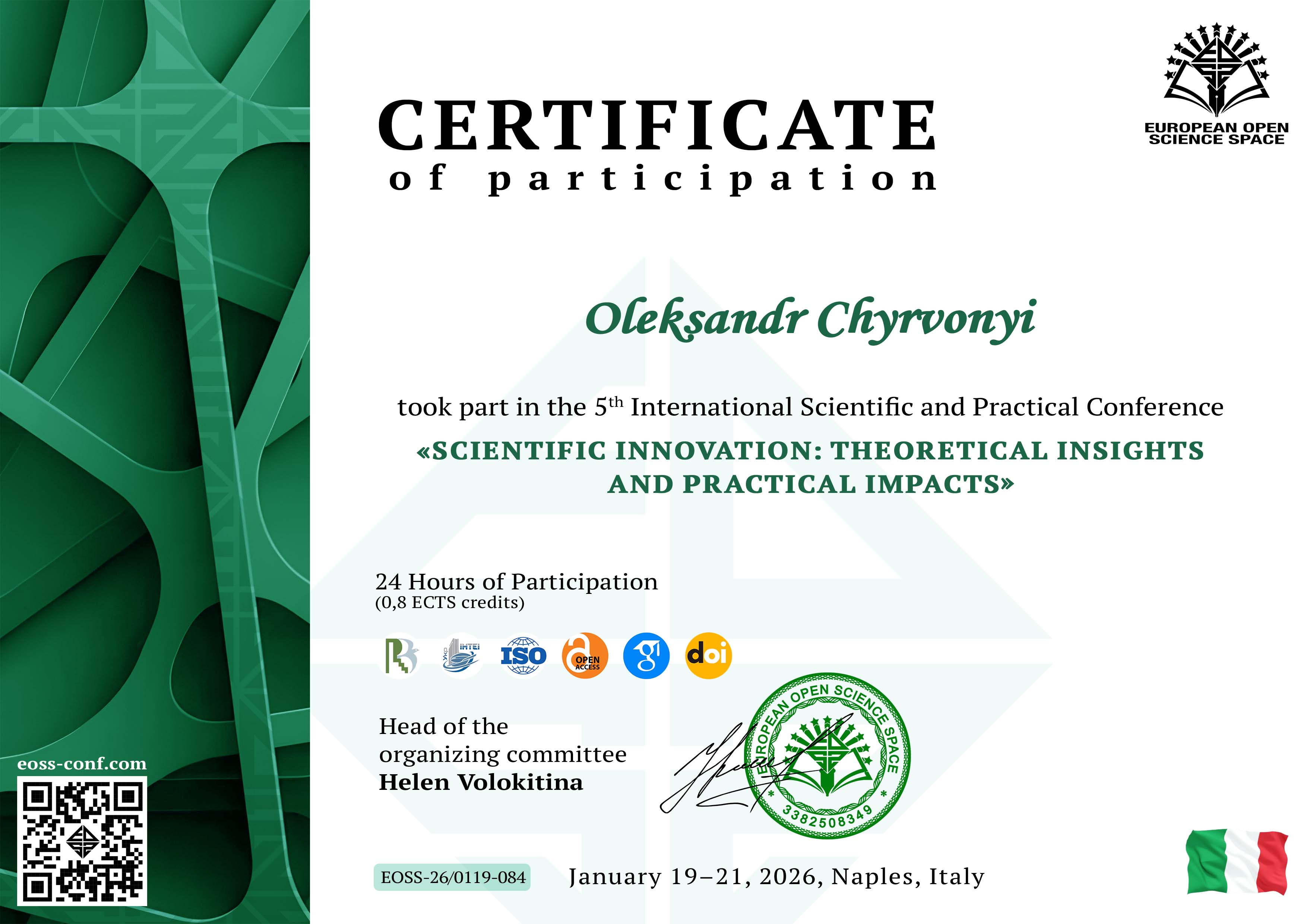 | 10689 | II Міжнародна науково-практична конференція «Integration of science and practice as a mechanism of effective development» | Лінгвістичний та соціолінгвістичний огляд сленгу Cyberpunk 2077 | Копенгаген, Данія |