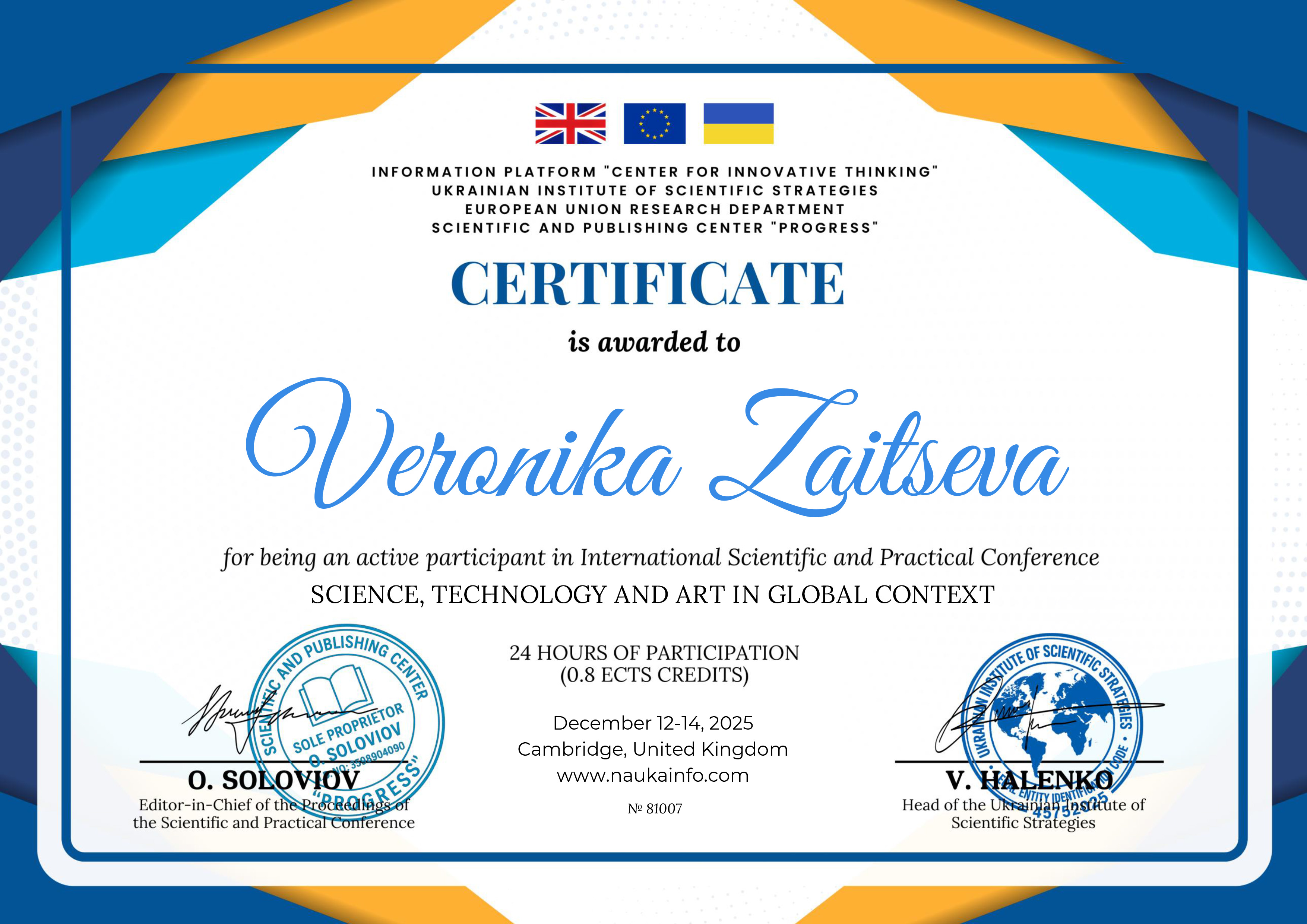 | 12946 | Міжнародна науково-практична конференція «SCIENCE, TECHNOLOGY AND ART IN GLOBAL CONTEXT» | Специфіка живописної композиції як підґрунтя художньо-творчої діяльності студентів спеціальності «образотворче мистецтво» | м. Кембридж, Велика Британія |