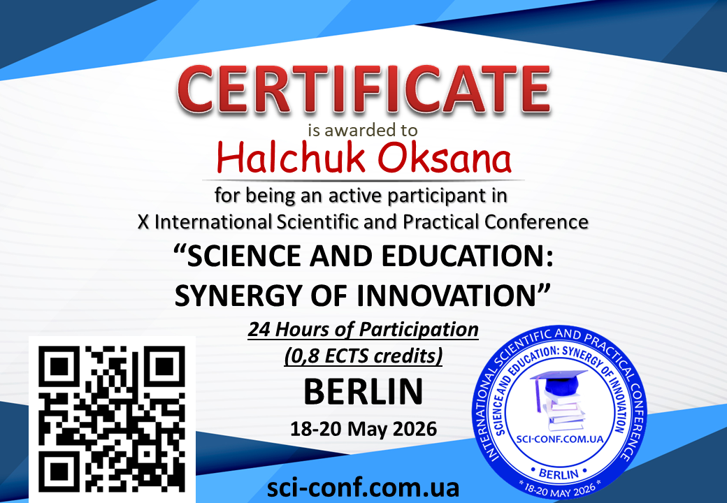 | 13296 | Х Міжнародна науково-практична конференція «Science and Education: Synergy of Innovation» | Інтерпретаційні моделі античного тексту в сучасних романах-міфах (на матеріалі творів Медлін Міллер). | Берлін (Німеччина) |