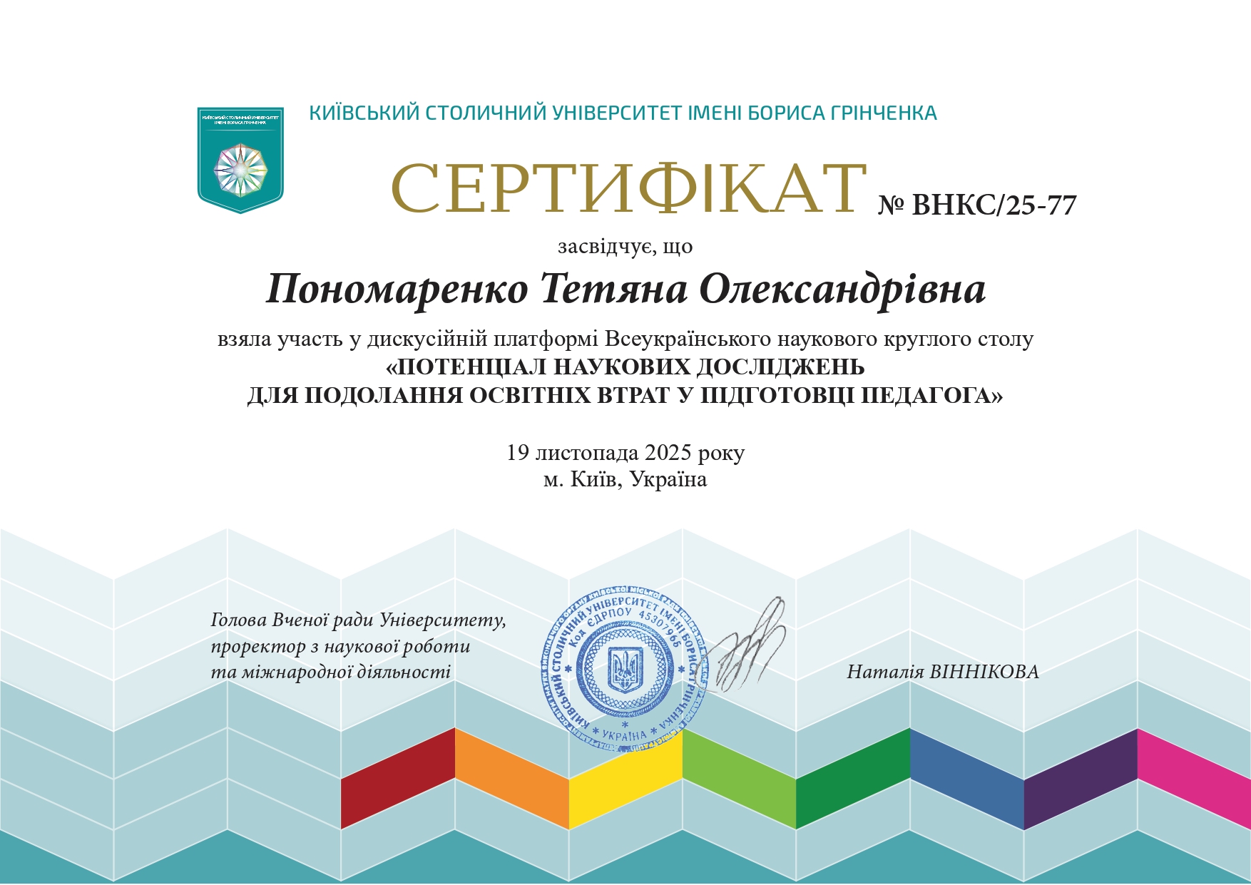 | 12792 | Всеукраїнський науковий круглий стіл "ПОТЕНЦІАЛ НАУКОВИХ ДОСЛІДЖЕНЬ ДЛЯ ПОДОЛАННЯ ОСВІТНІХ ВТРАТ У ПІДГОТОВЦІ ПЕДАГОГА" | Діагностування академічних розривів у студентів спеціальності «Дошкільна освіта» в перебігу вивчення освітніх компонентів | Київ, Київський столичний університет імені Бориса Грінченка |