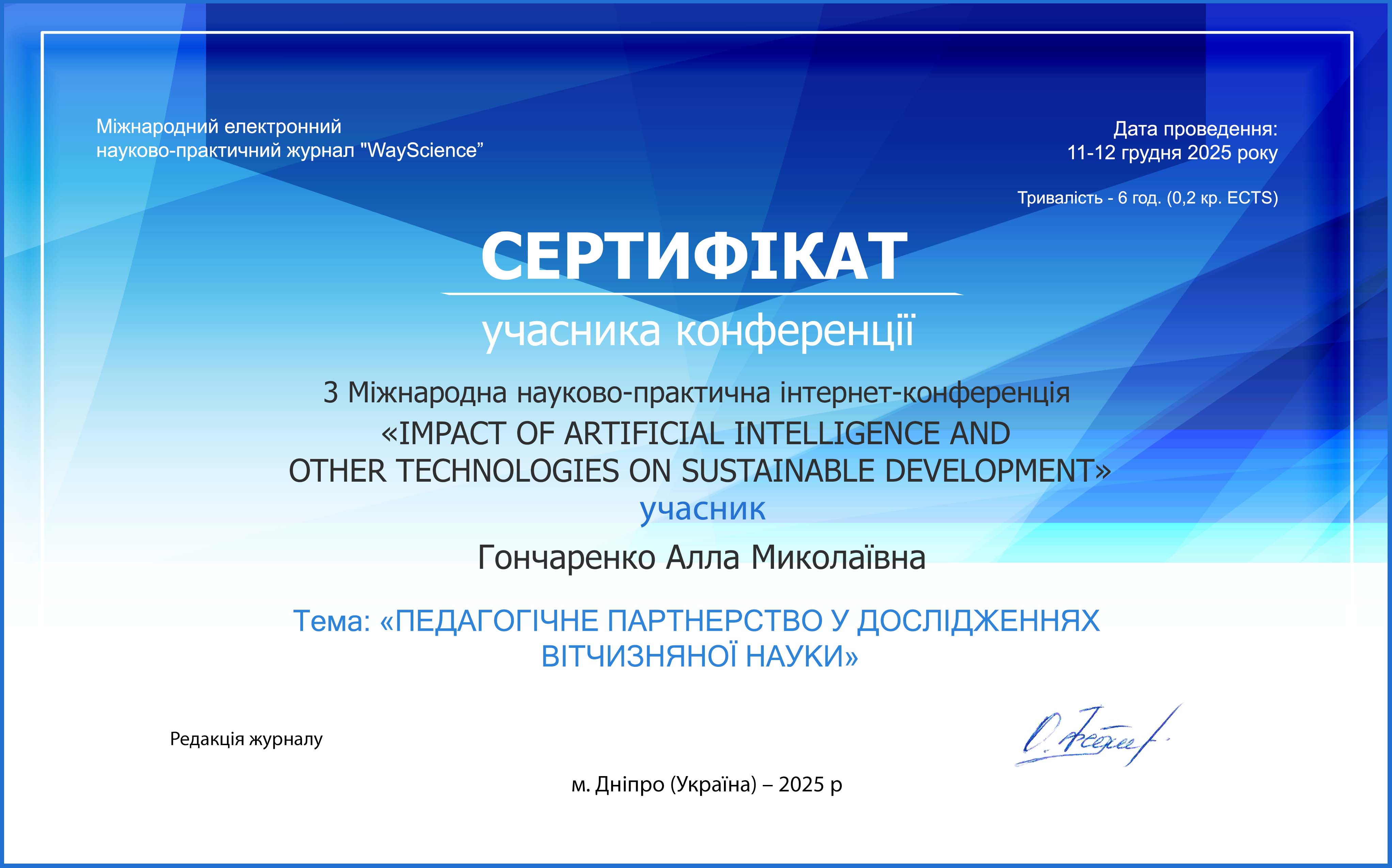 | 12926 | Impact of Artificial Intelligence and Other Technologies on Sustainable Development | ПЕДАГОГІЧНЕ ПАРТНЕРСТВО У ДОСЛІДЖЕННЯХ ВІТЧИЗНЯНОЇ НАУКИ | м. Дніпро |