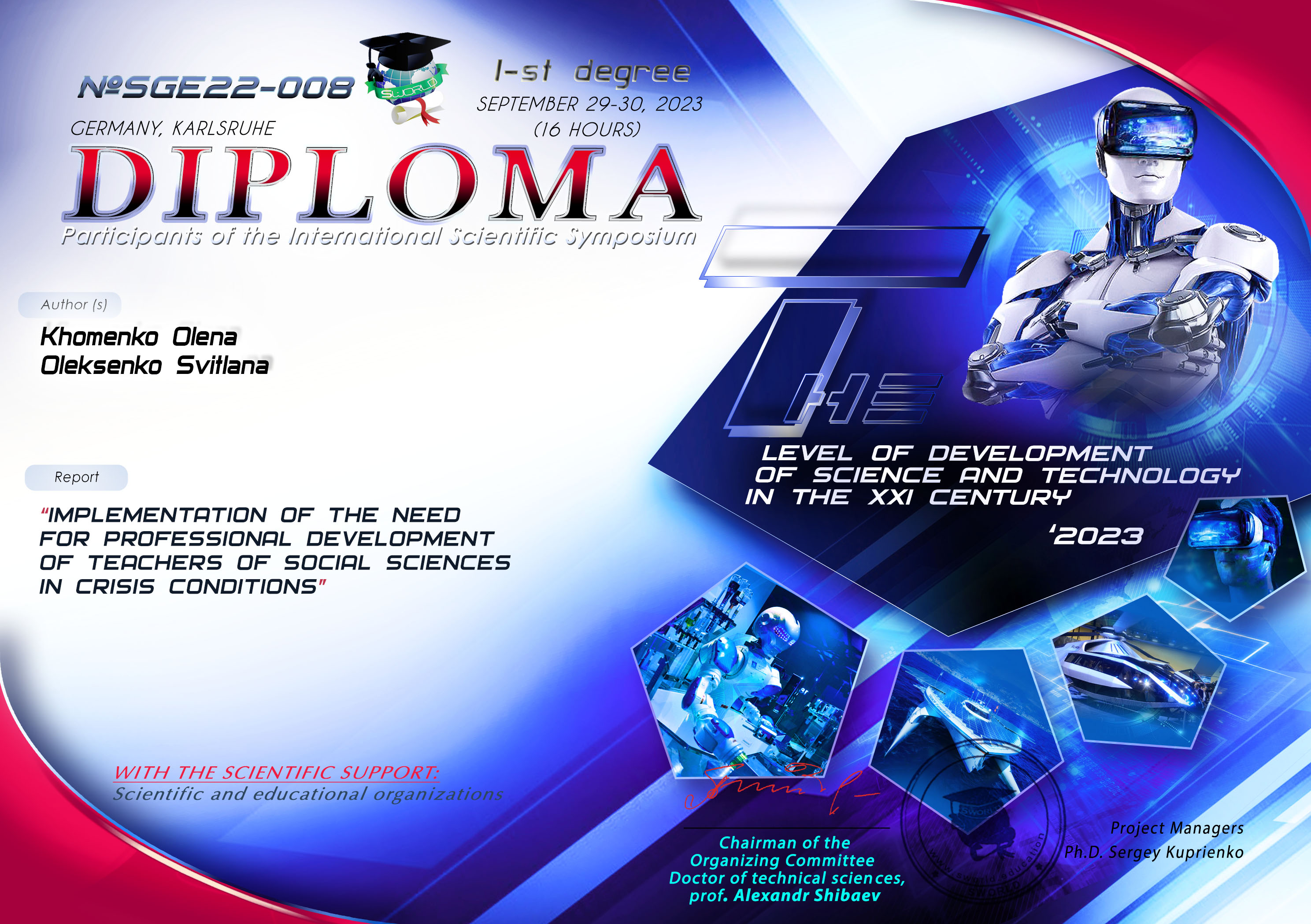 | 9890 | The level of development of science and technology in the XXI century '2023" | Реалізація потреби в професійному розвитку вчителів суспільствознавчих дисциплін в умовах кризи | Karlsruhe, Germany |