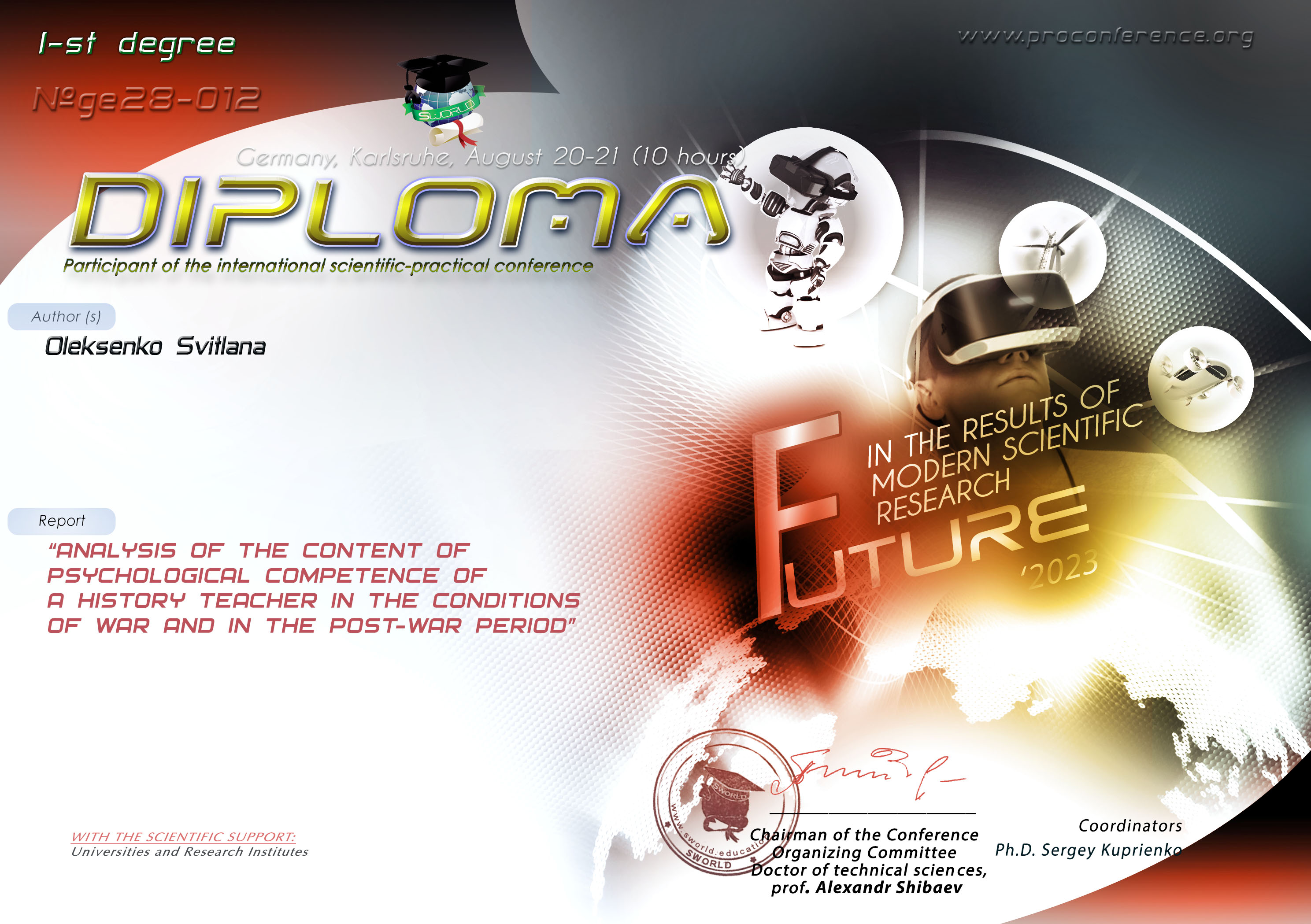 | 46393 | Analysis of the content of psychological competence of a history teacher in the conditions of war and in the post-war period | |