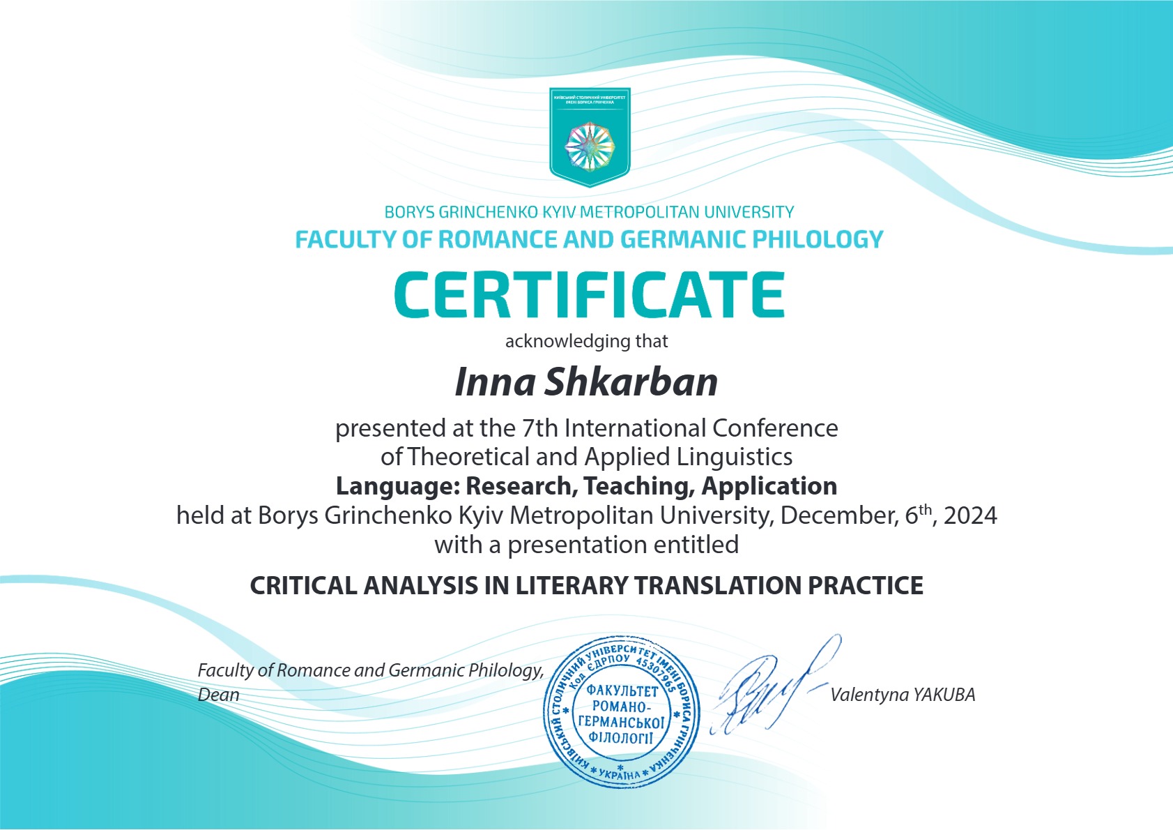 | 11302 | the 7th International Conference of Theoretical and Applied Linguistics Language: Research, Teaching, Application | Critical analysis in literary translation practice | BORYS GRINCHENKO KYIV METROPOLITAN UNIVERSITY |
