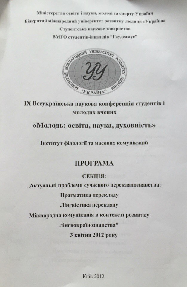 | 1146 | IX Всеукраїнська наукова конференція студентів і молодих вчених 'Молодь: освіта, наука, духовність' | Труднощі перекладу аналітичної статті на політичну тематику | Відкритий міжнародний університет розвитку людини 'Україна', Інститут філології та масових комунікацій |