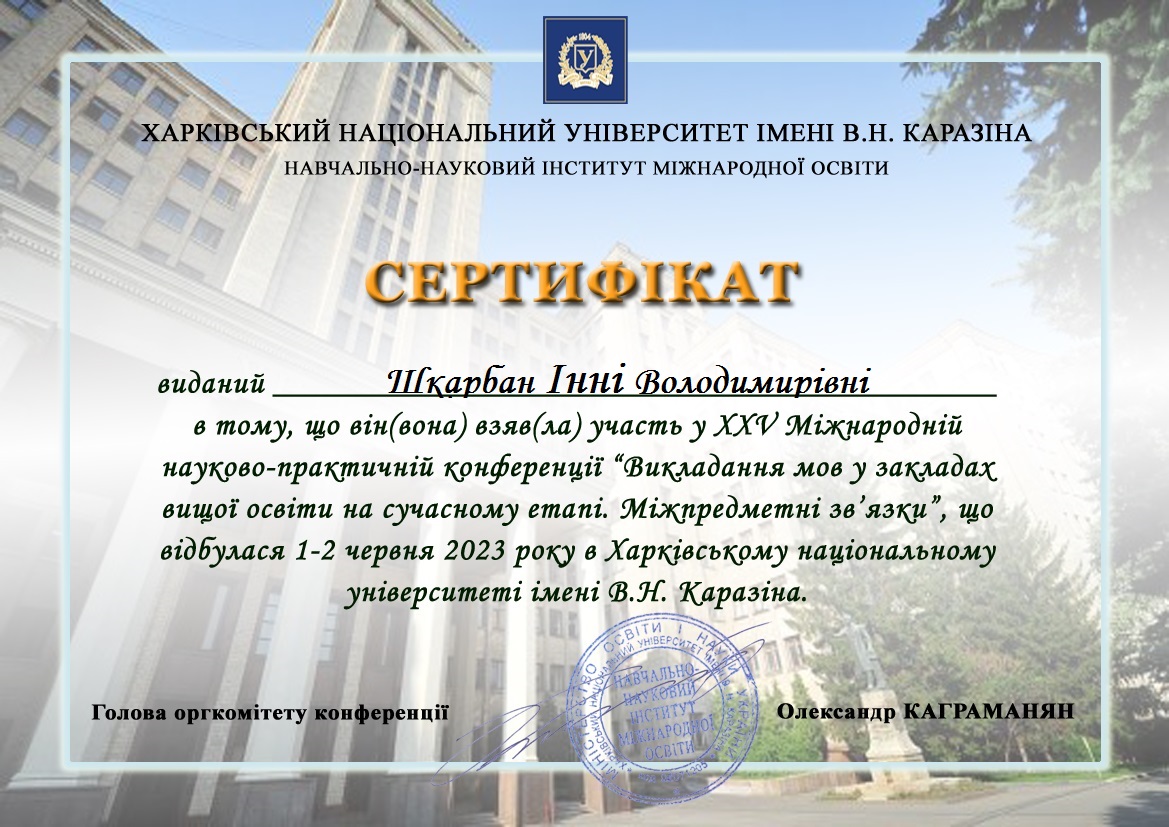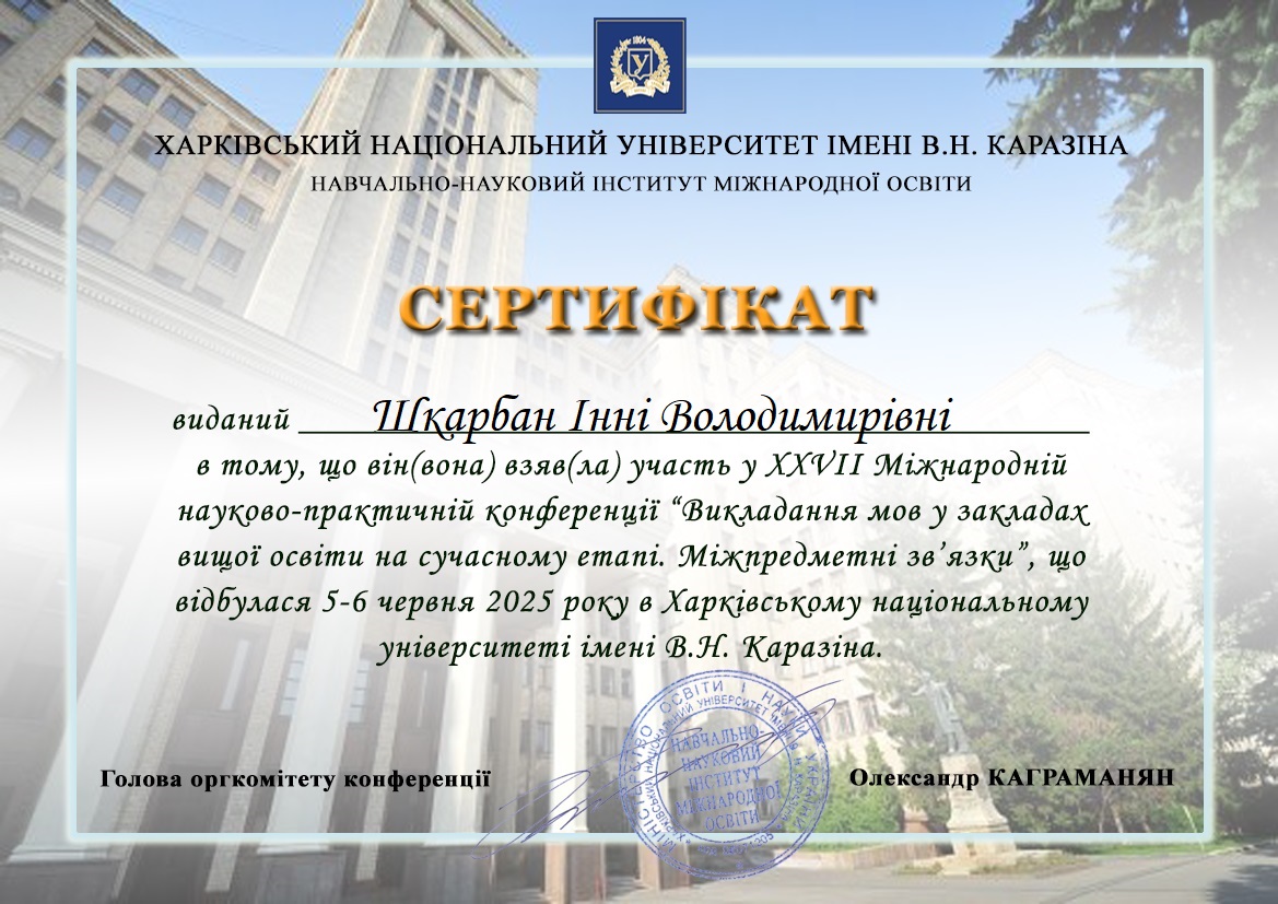 | 10545 | XXVI Міжнародна науково-практична конференція "Викладання мов у закладах вищої освіти на сучасному етапі. Міжпредметні зв'язки" | Development of students' intercultural competence by foreign language means | Харківський національний університет імені В.Н.Каразіна |