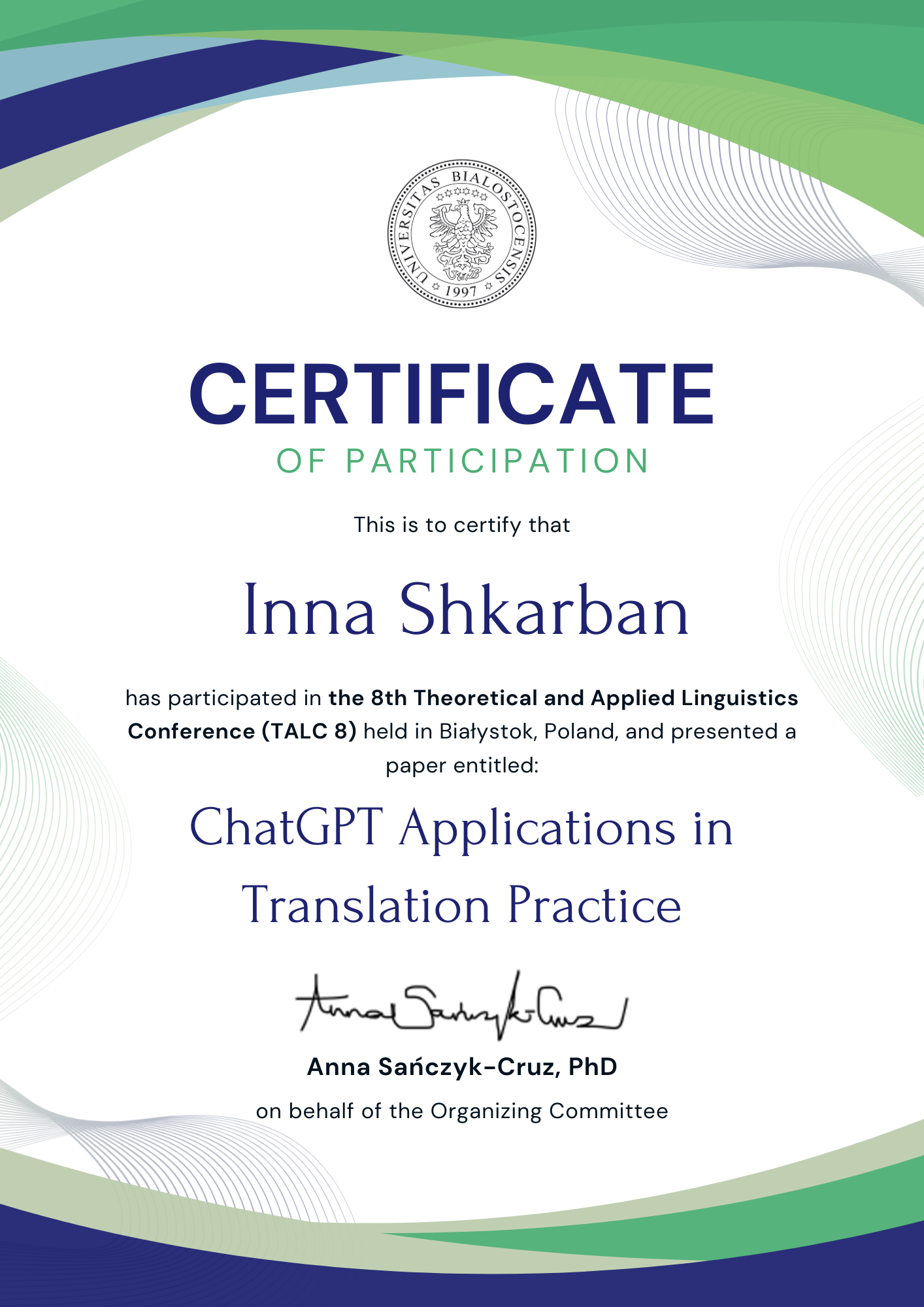 | 12695 | Linguistic Innovations in a Globally Interconnected World. 8th Białystok-Kyiv Conference on Theoretical and Applied Linguistics | ChatGPT applications in translation practice | Białystok, Poland |