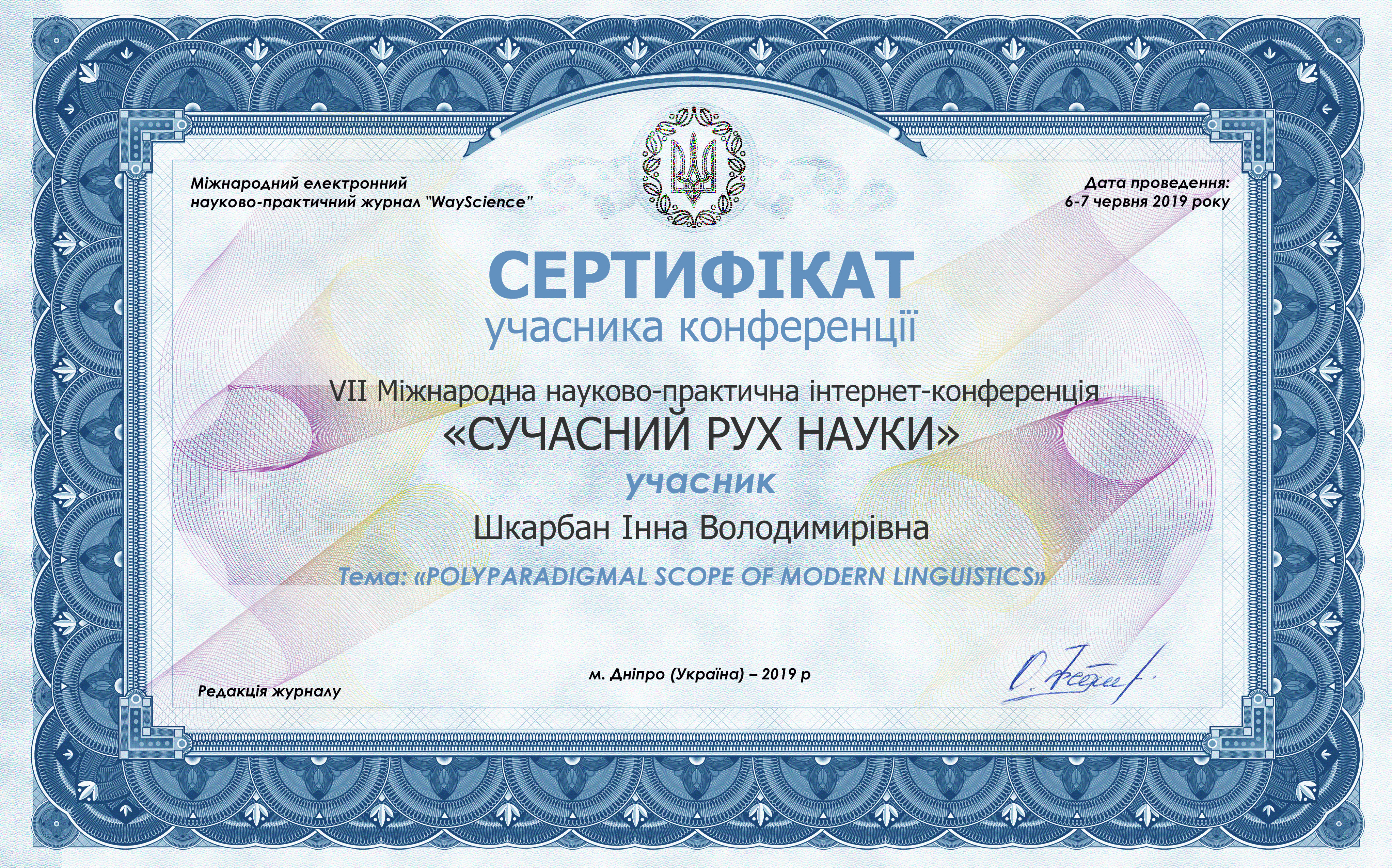 | 4279 | VII Міжнародна науково-практична інтернет-конференція | Polyparadigmal Scope of Modern Linguistics | м. Дніпро |