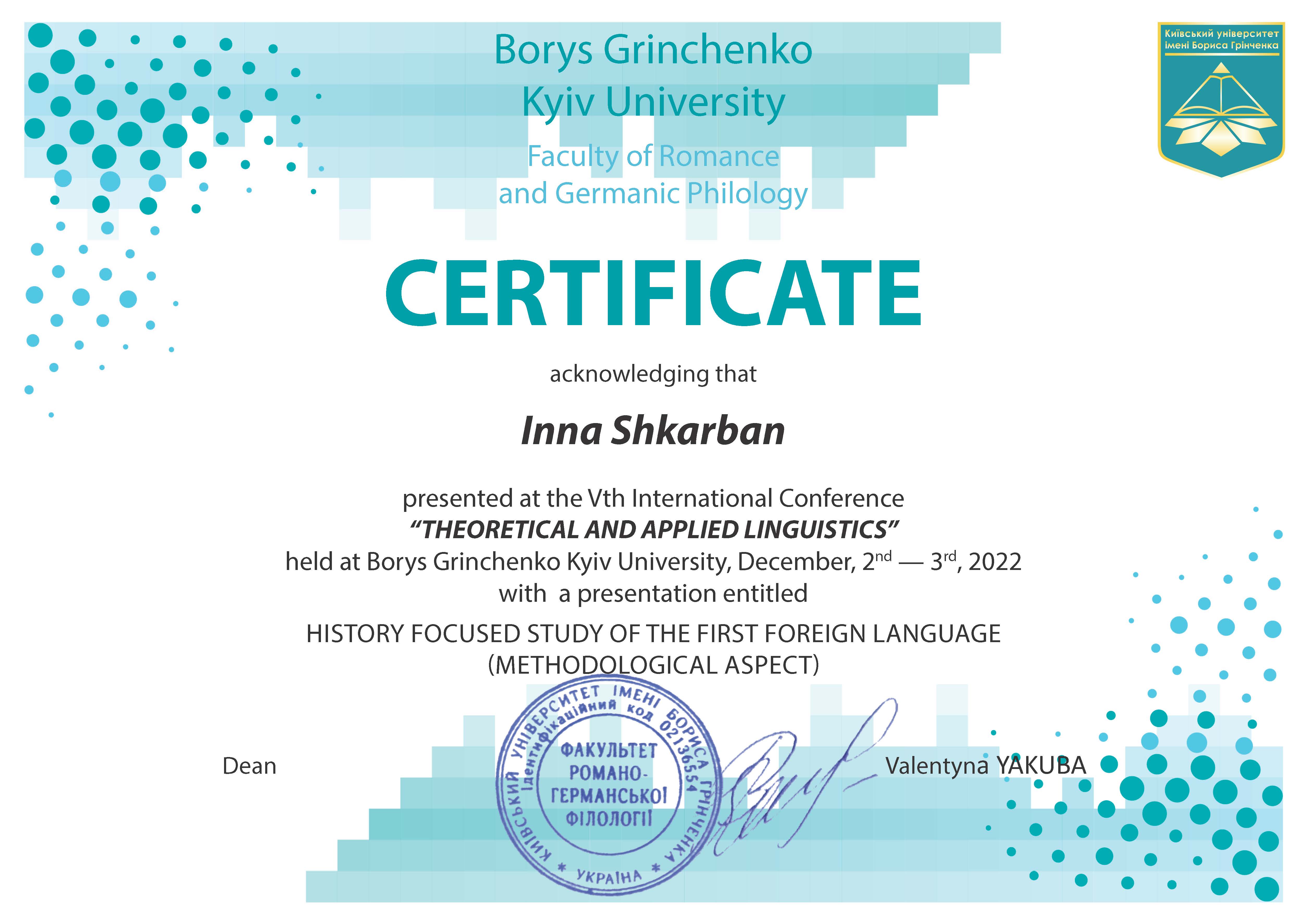 | 8595 | THE 5th KYIV AND BIAŁYSTOK CONFERENCE V міжнародна науково-практична Конференція з проблем ТЕОРЕТИЧНОЇ ТА ПРИКЛАДНОЇ ЛІНГВІСТИКИ | History focused study of the First Foreign Language (Methodological aspect) | Kyiv Borys Grinchenko University, Faculty of Romance and Germanic Philology |