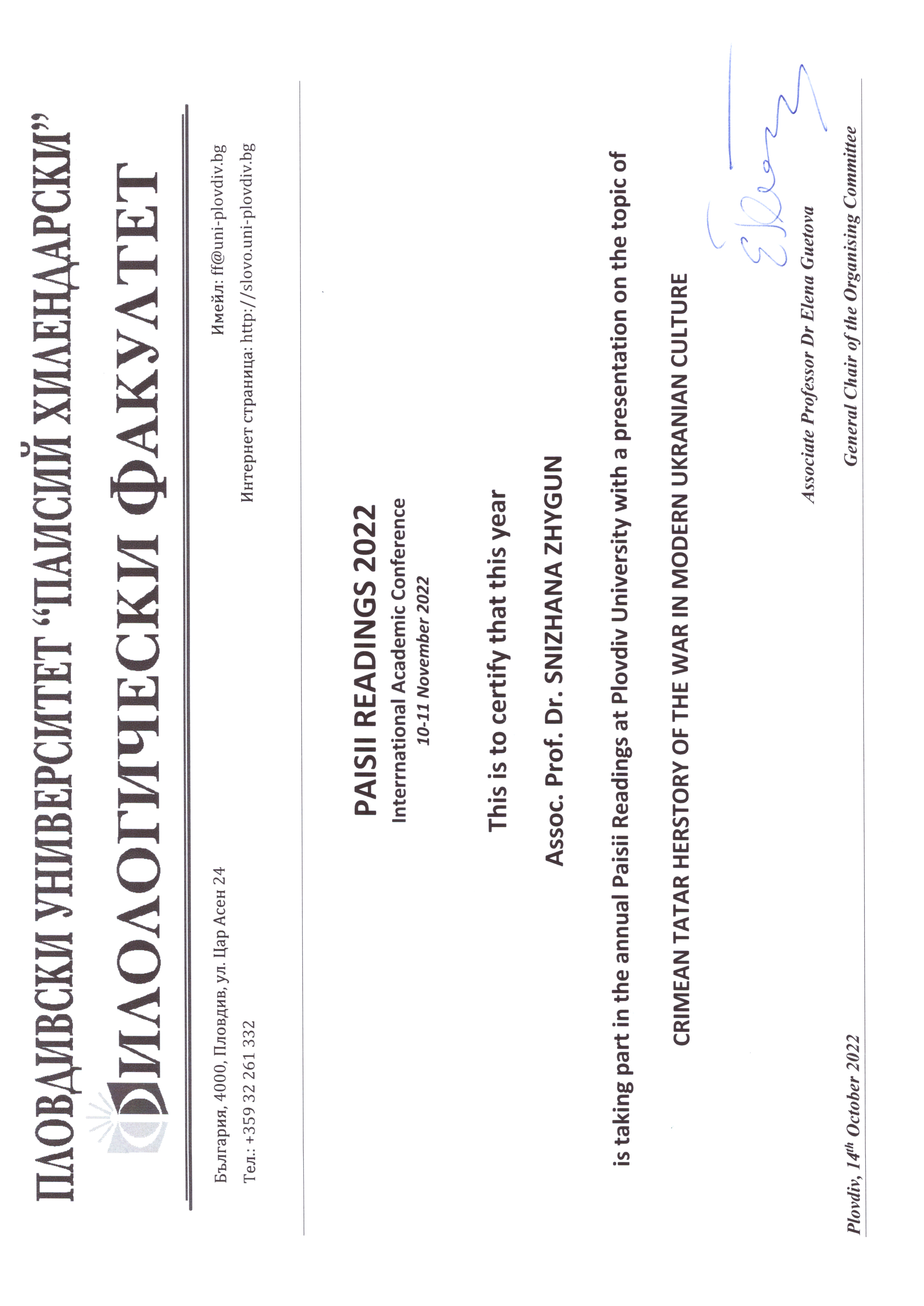 | 8412 | Паісієві читання 2022 | Crimean Tatar herstory of the war in modern Ukrainian culture | Пловдив, Болгарыя |