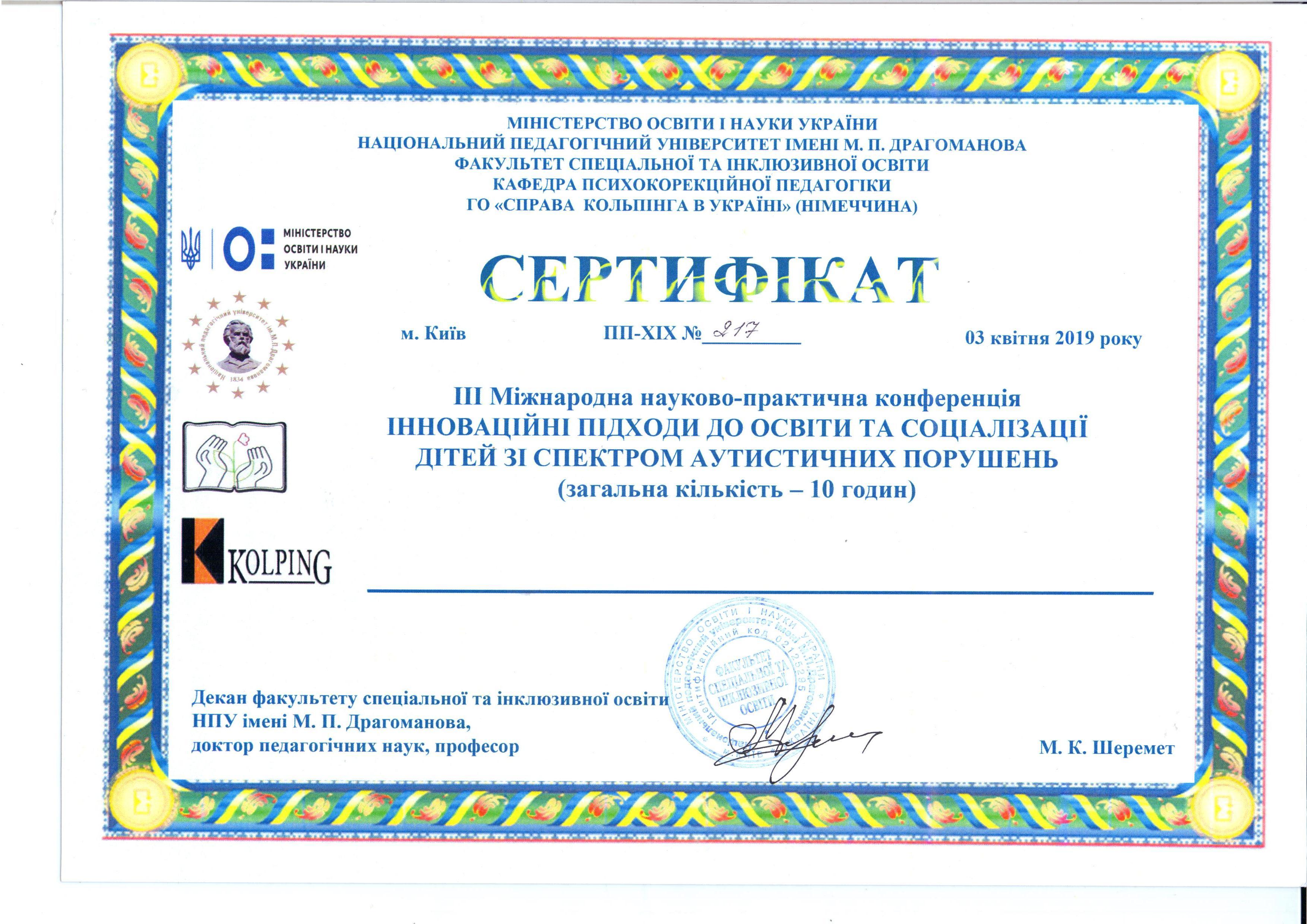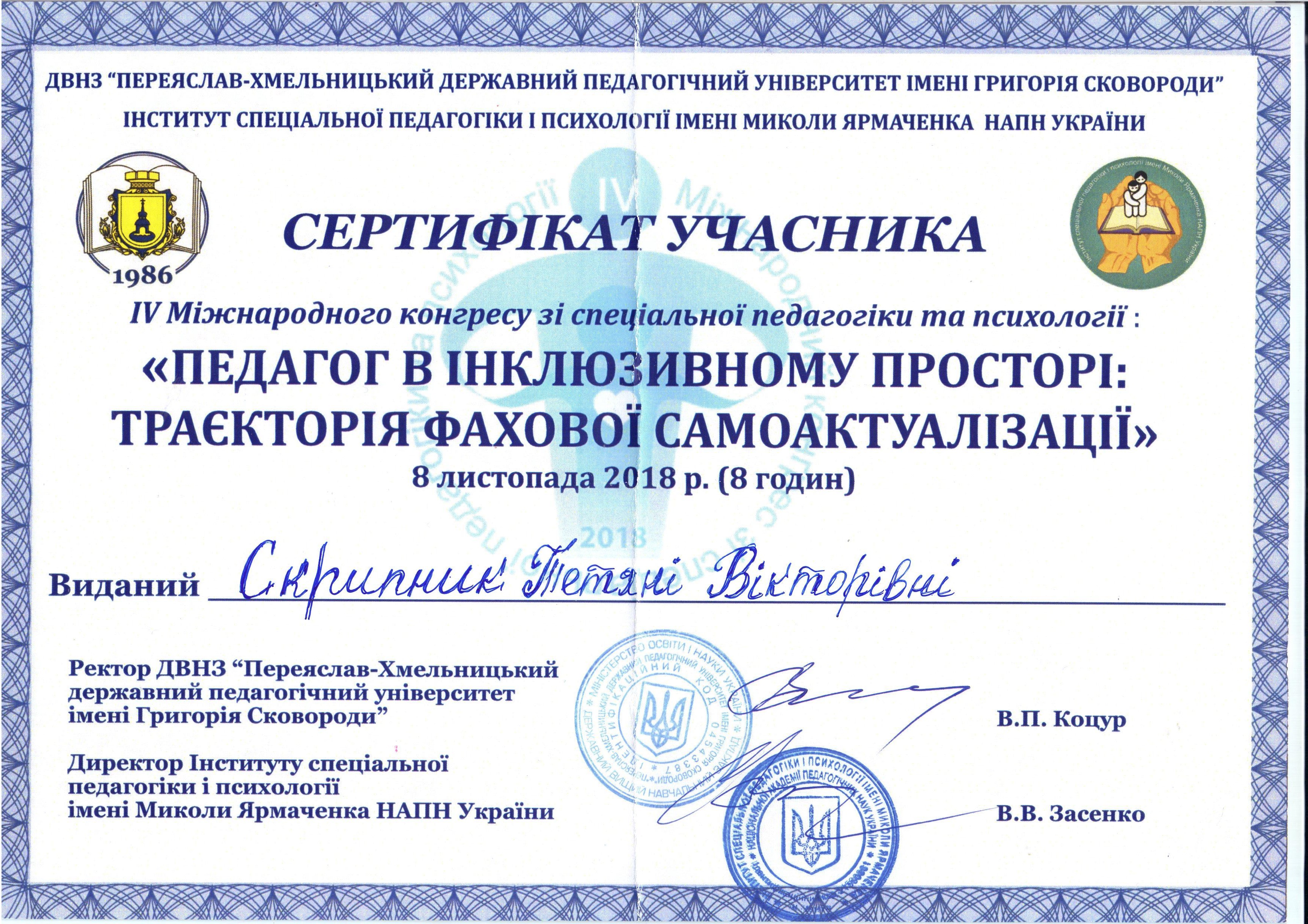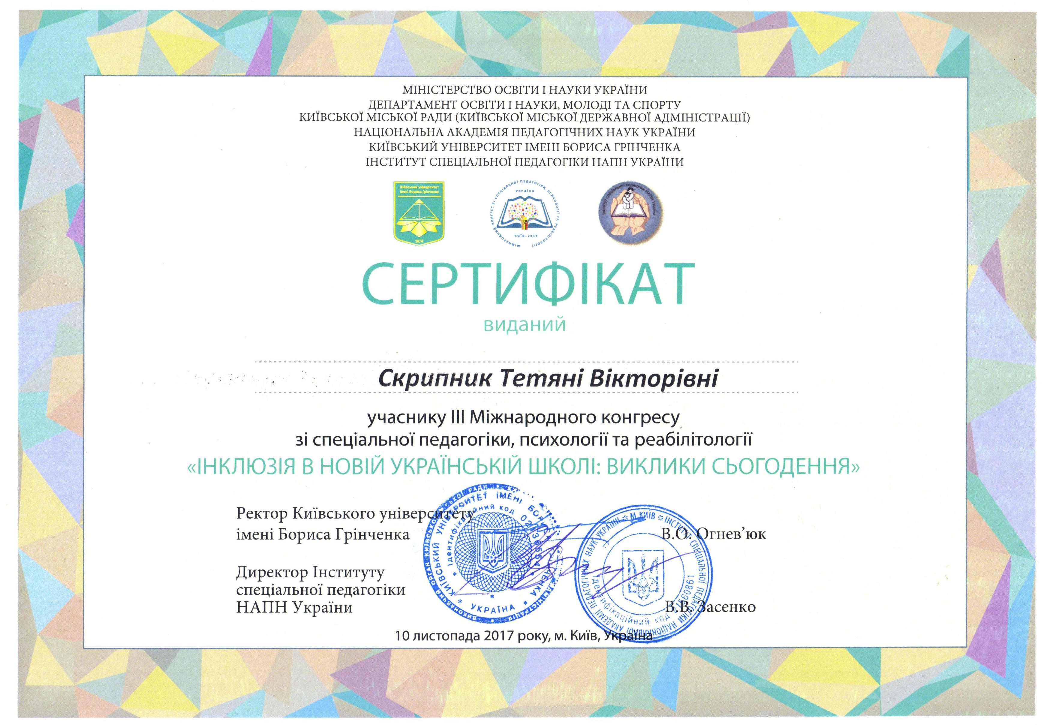 | 4962 | Всеукраїнська науково-практична конференція "Бар'єри та стратегії розвитку дітей з особливими потребами в освітньому середовищі"" | учасник конференції | м. Київ | document.tif | |