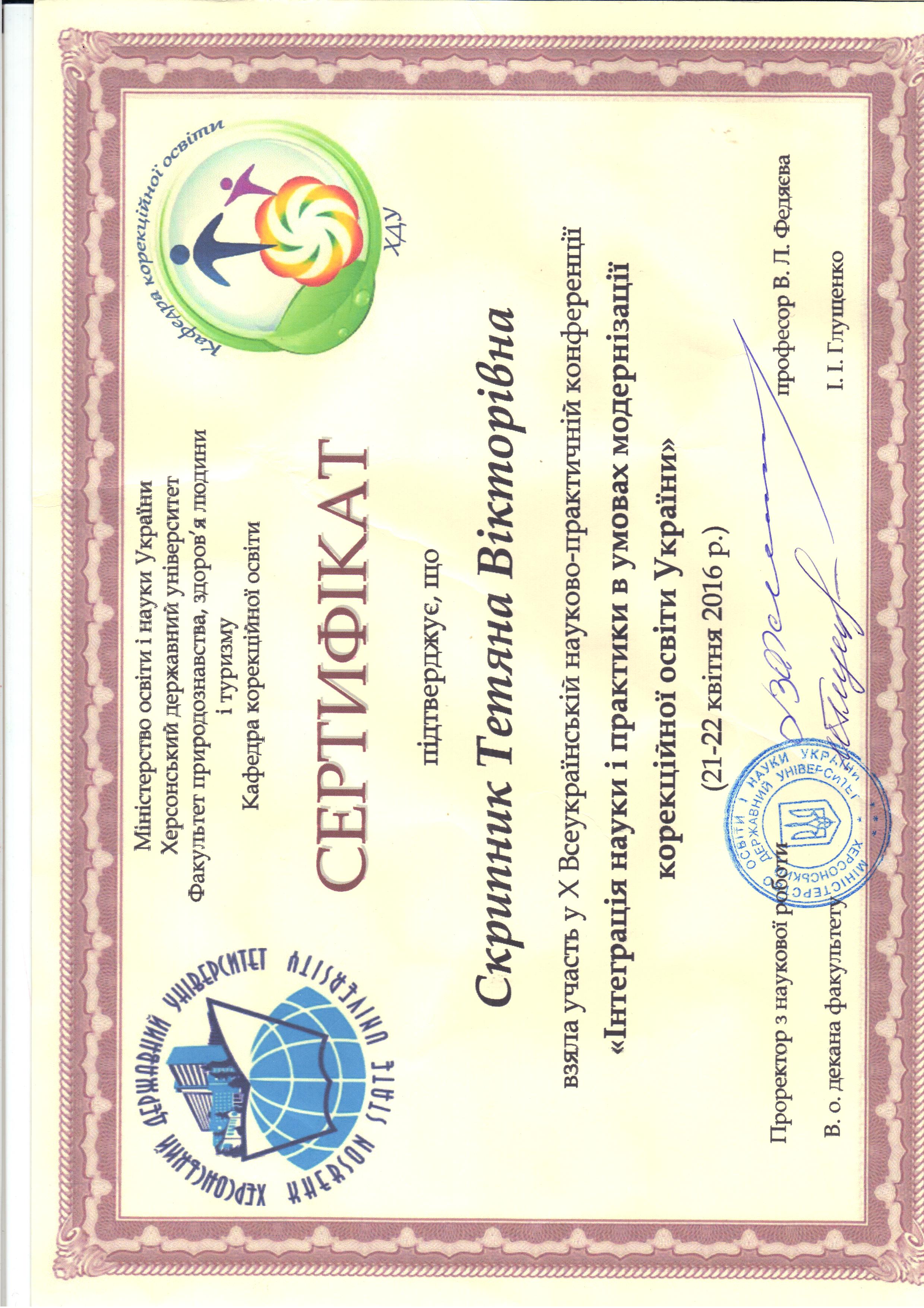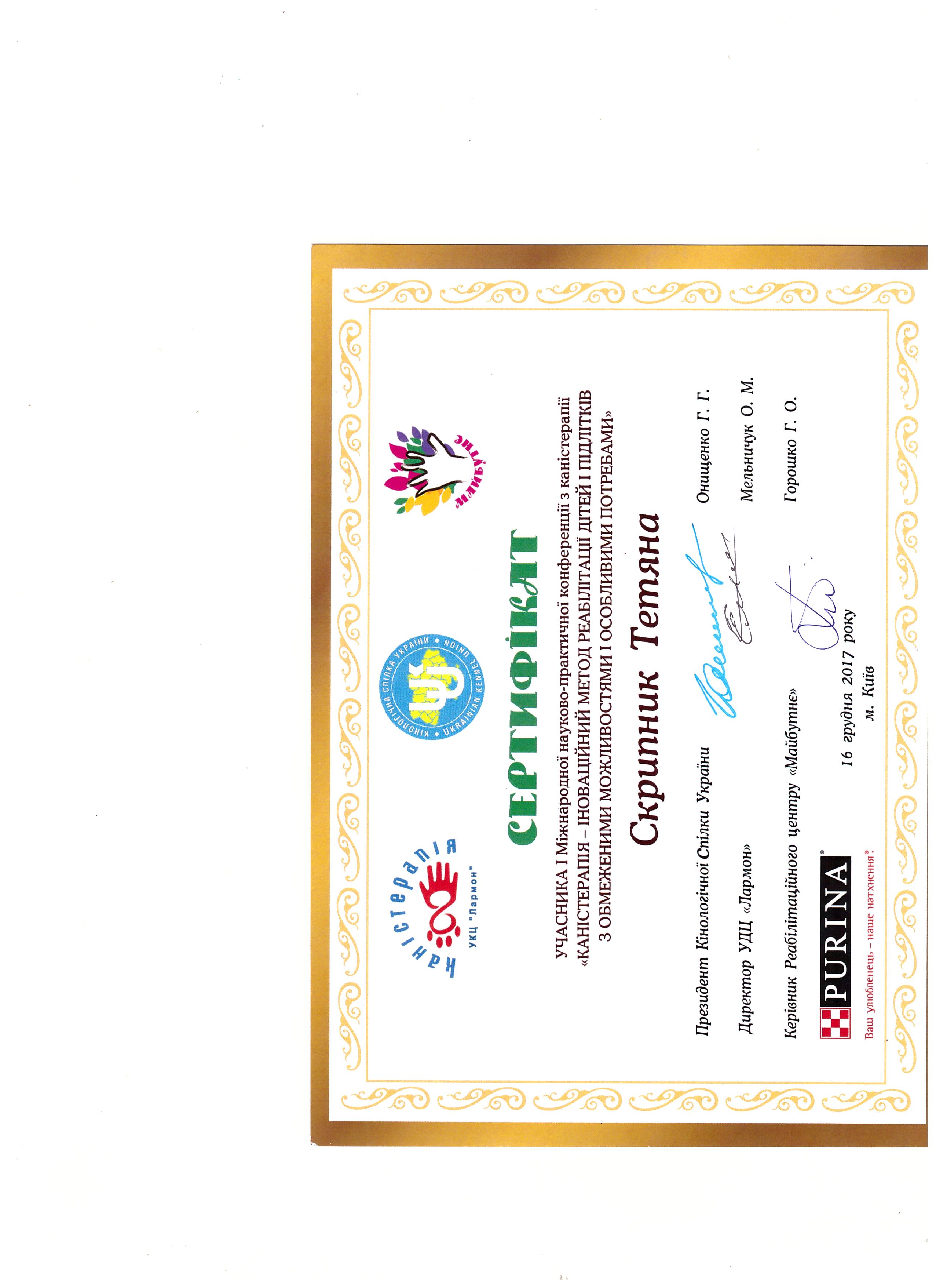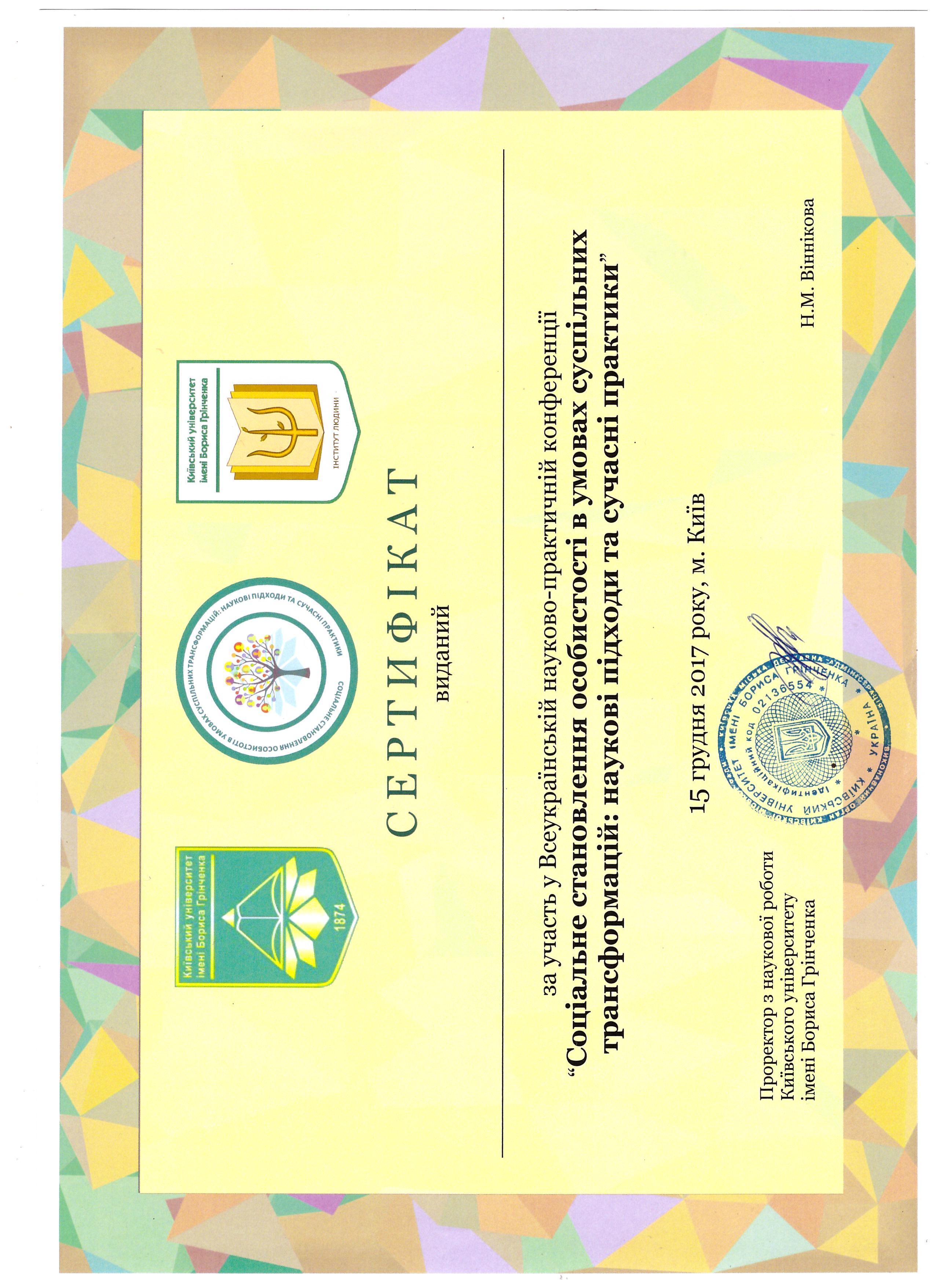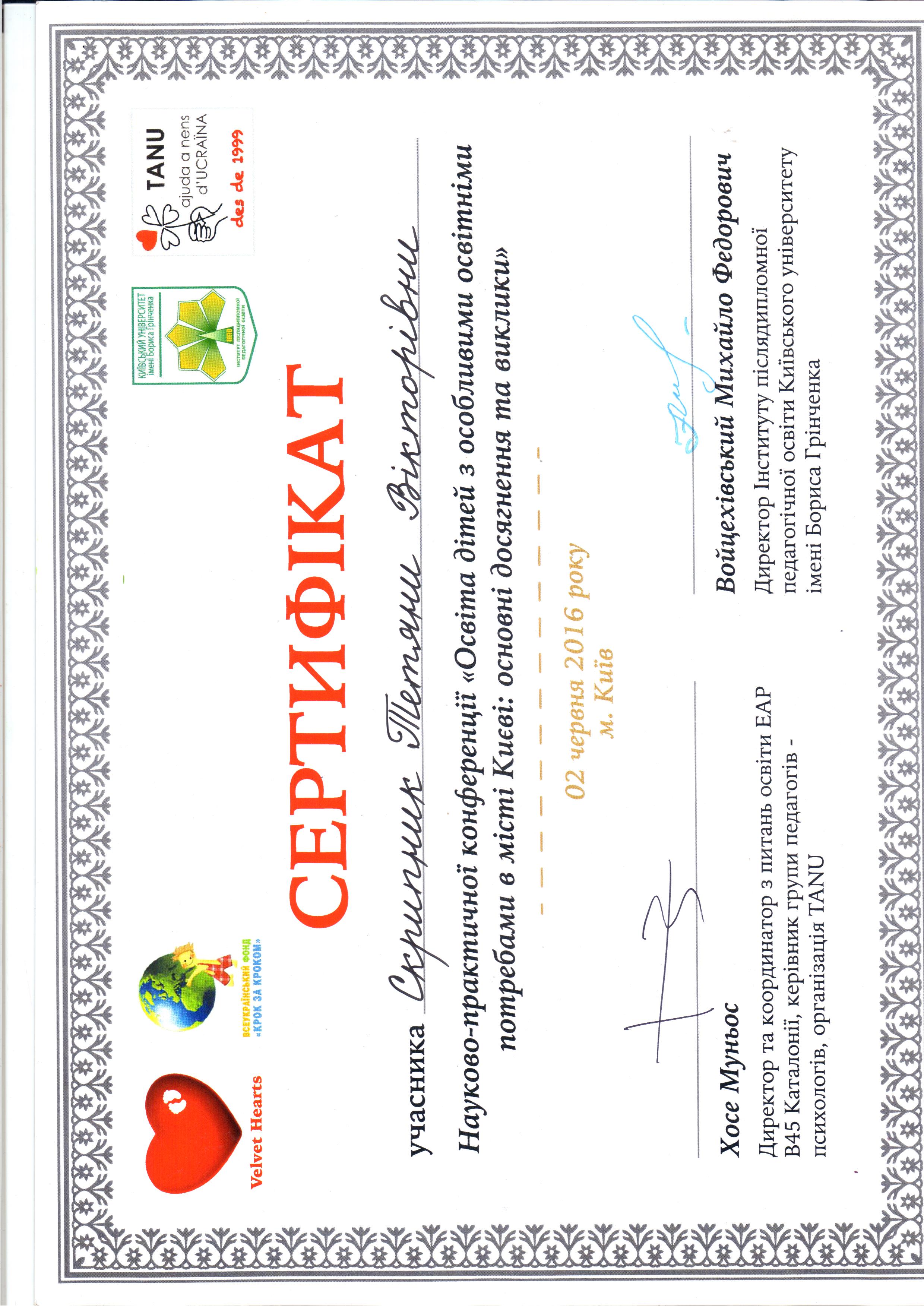 | 4962 | Всеукраїнська науково-практична конференція "Бар'єри та стратегії розвитку дітей з особливими потребами в освітньому середовищі"" | учасник конференції | м. Київ | document.tif | |