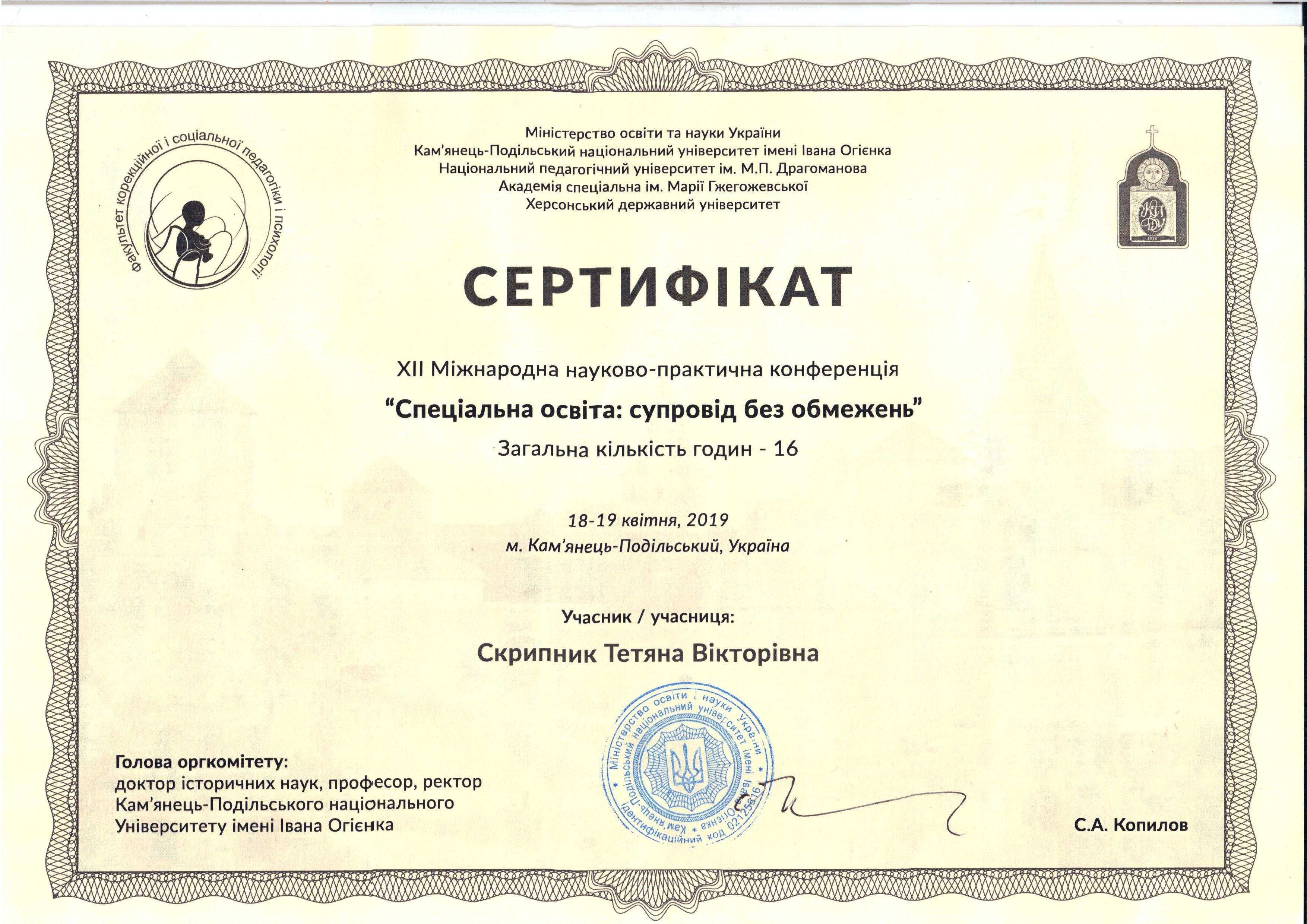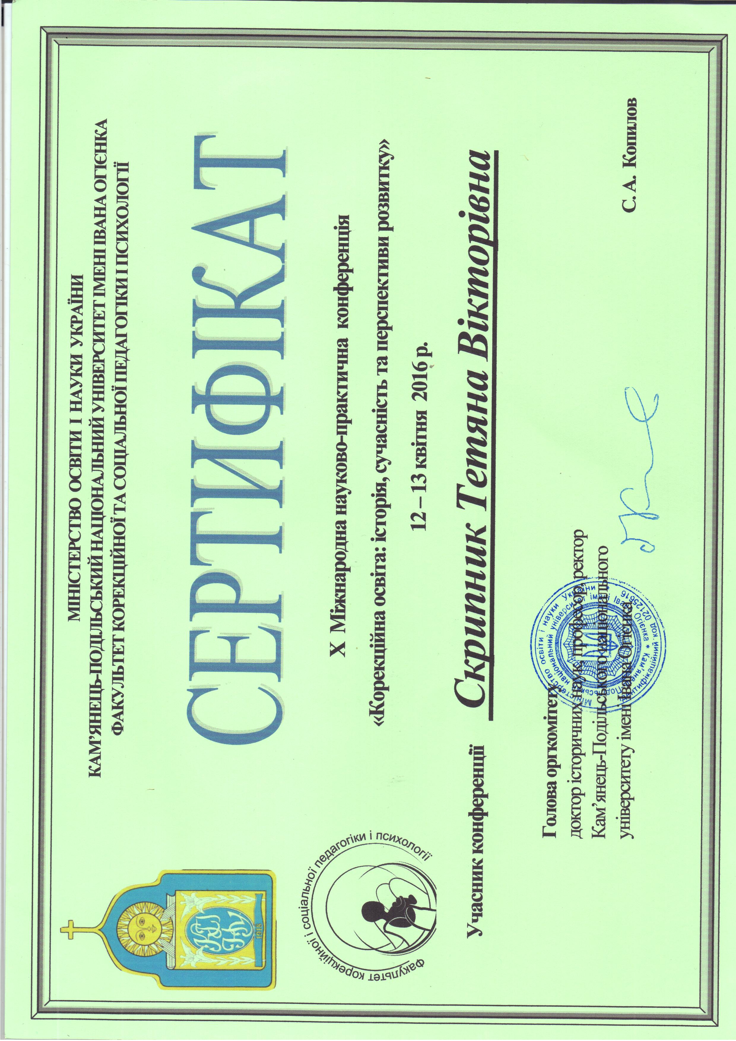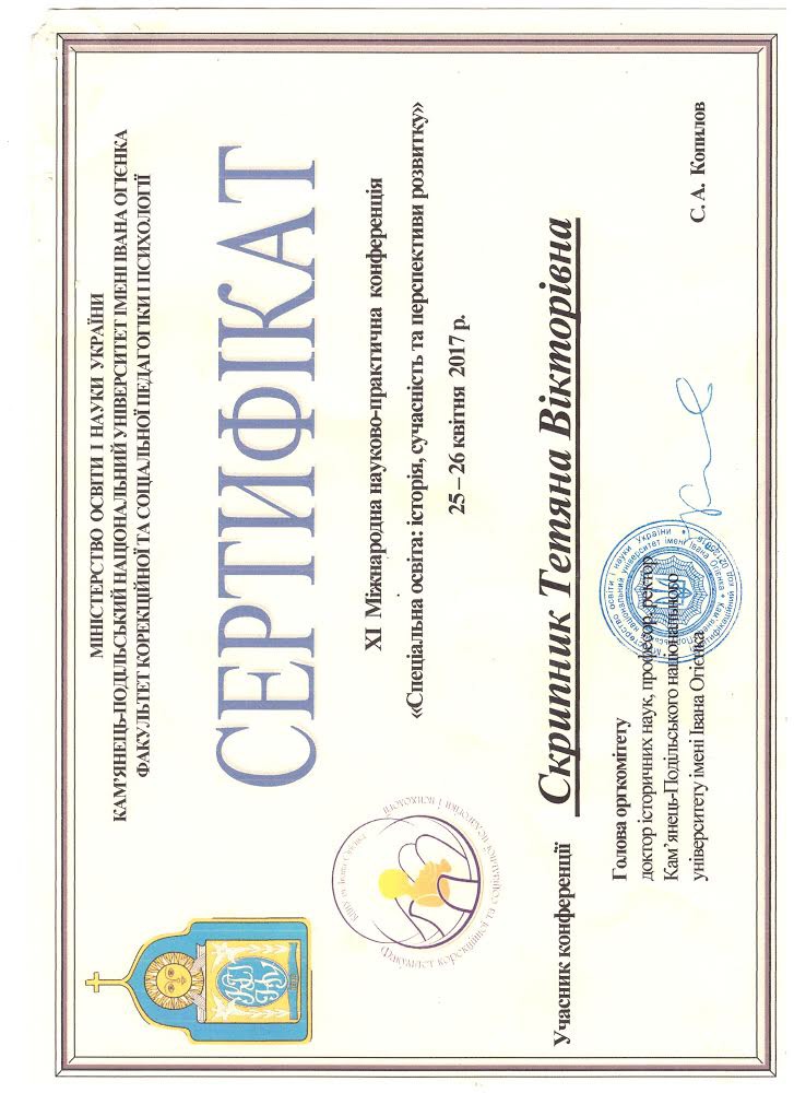 | 2820 | ХІ Міжнародна науково-практична конференція "Спеціальна освіта: історія, сучасність та перспективи розвитку"" | "Класний менеджмент як інноваційна технологія перетворення освітнього середовища" | м.Кам'янець-Подільський |