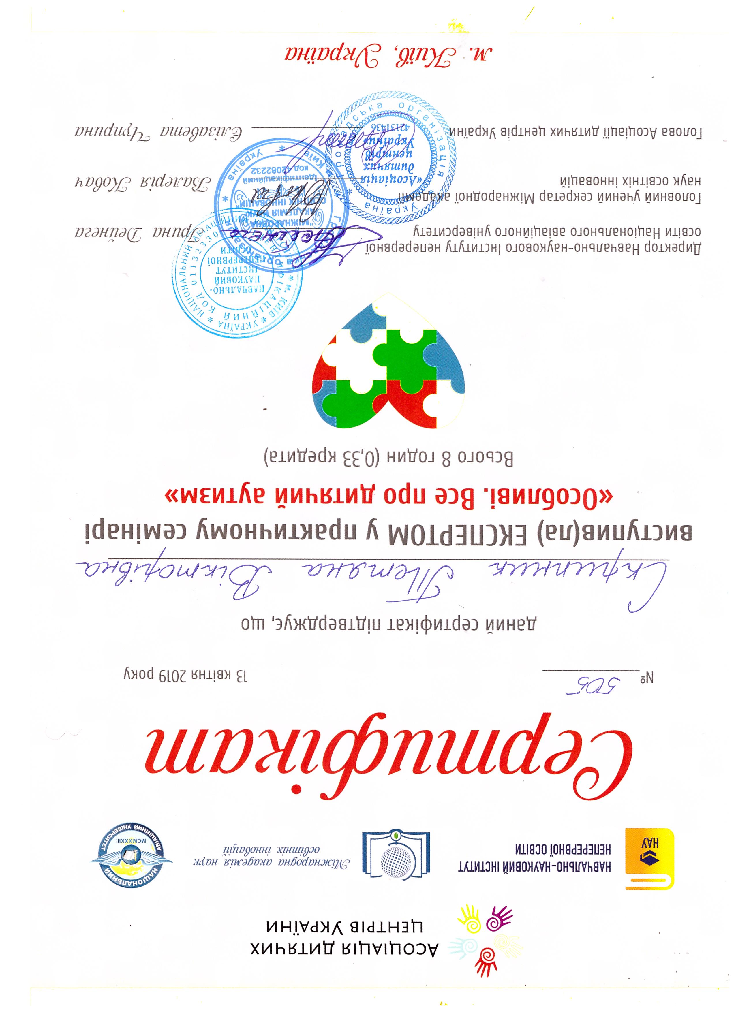 | 8270 | Грамота за перемогу в Конкурсі освітніх технологій. Наук.-методичний журнал «Дошкільне виховання» | Соціальний розвиток дітей інклюзивної групи | м. Київ | document.pdf | |