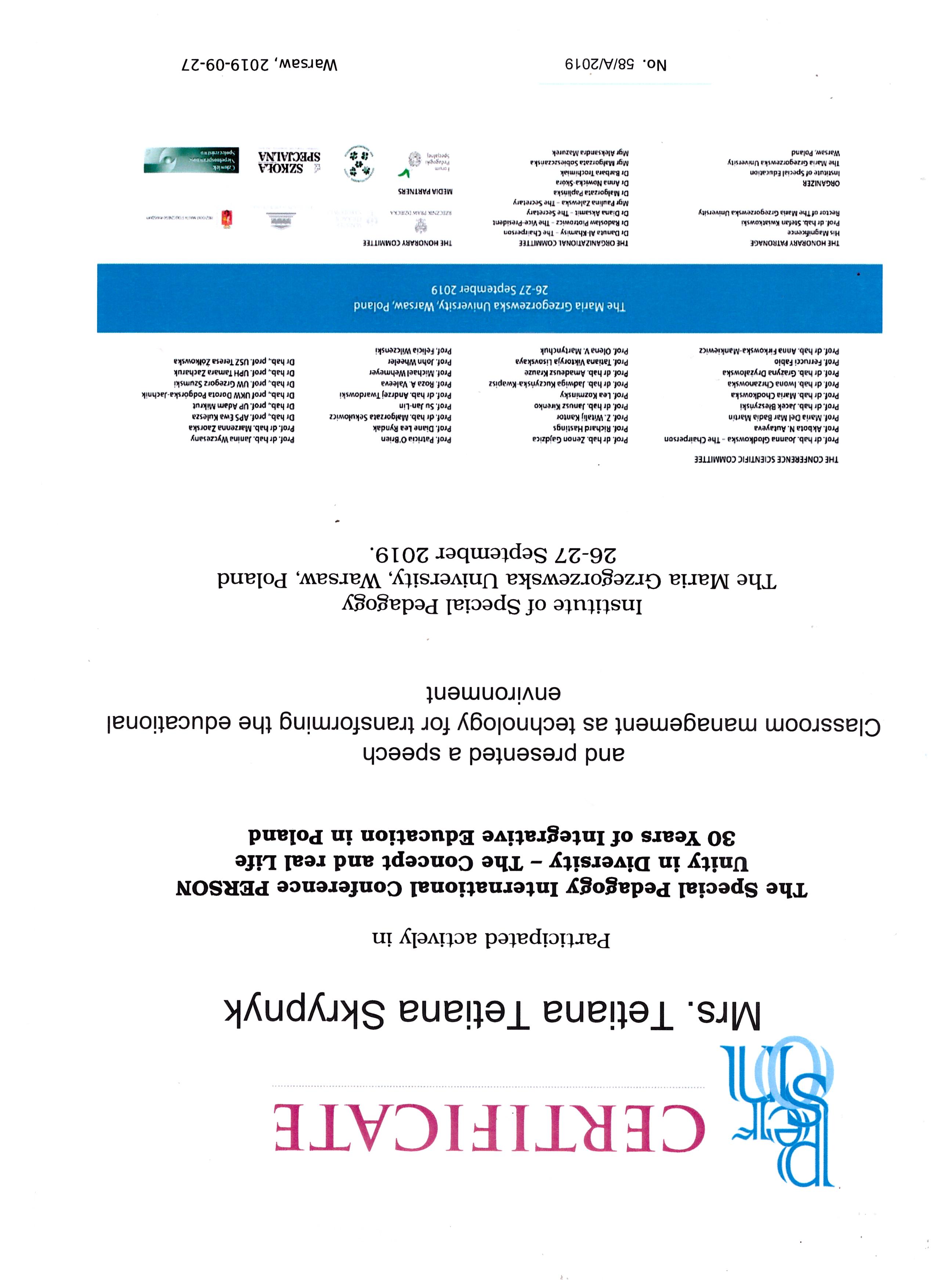 | 3668 | V Międzynarodowy Kongres Inkluzji Społecznej | Technologie zarządzania klasą jako sposób kształtowania inteligencji emocjonalnej u dzieci ze specjalnymi potrzebami edukacyjnymi | Siedlcach Польща | document.docx | |
