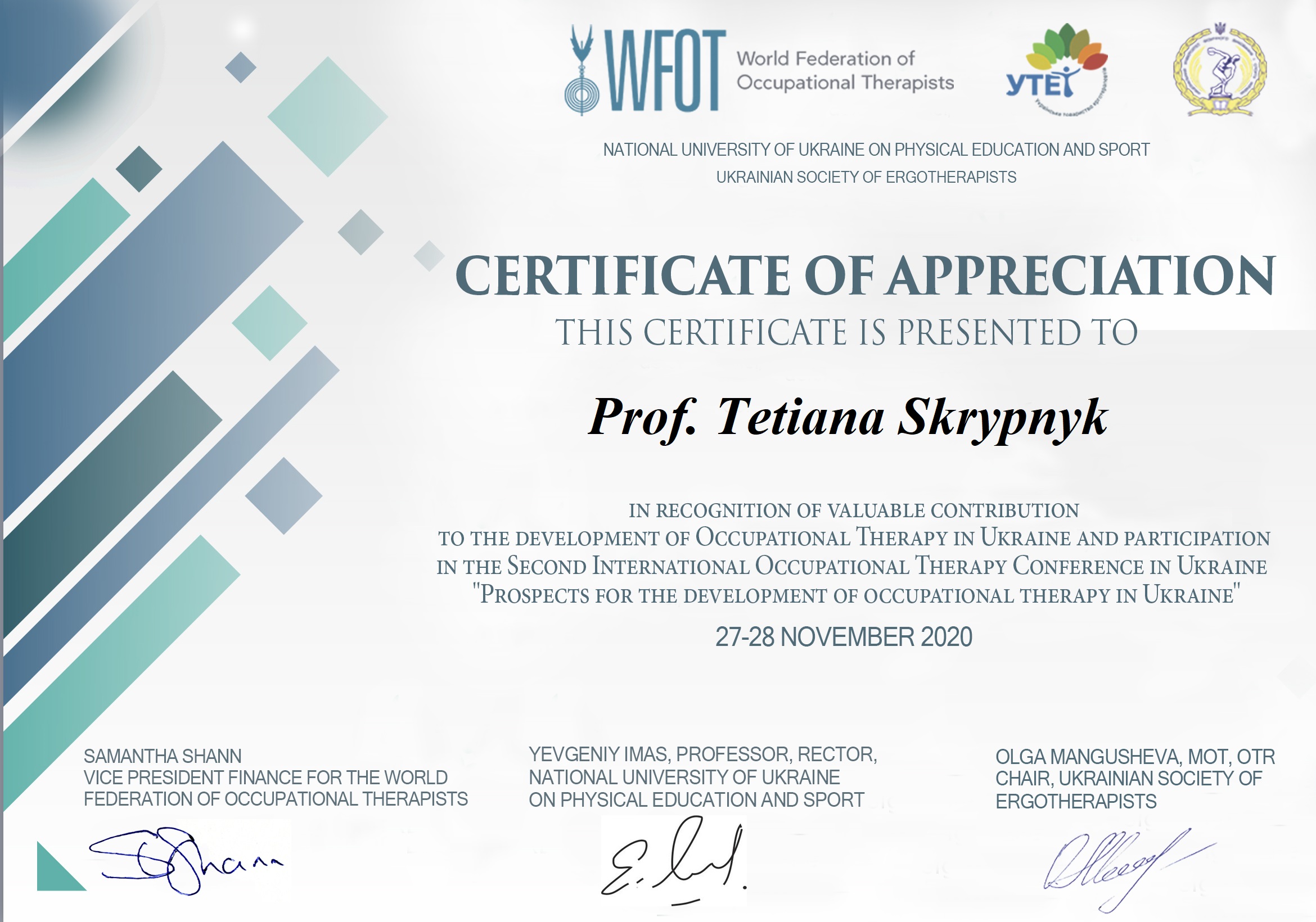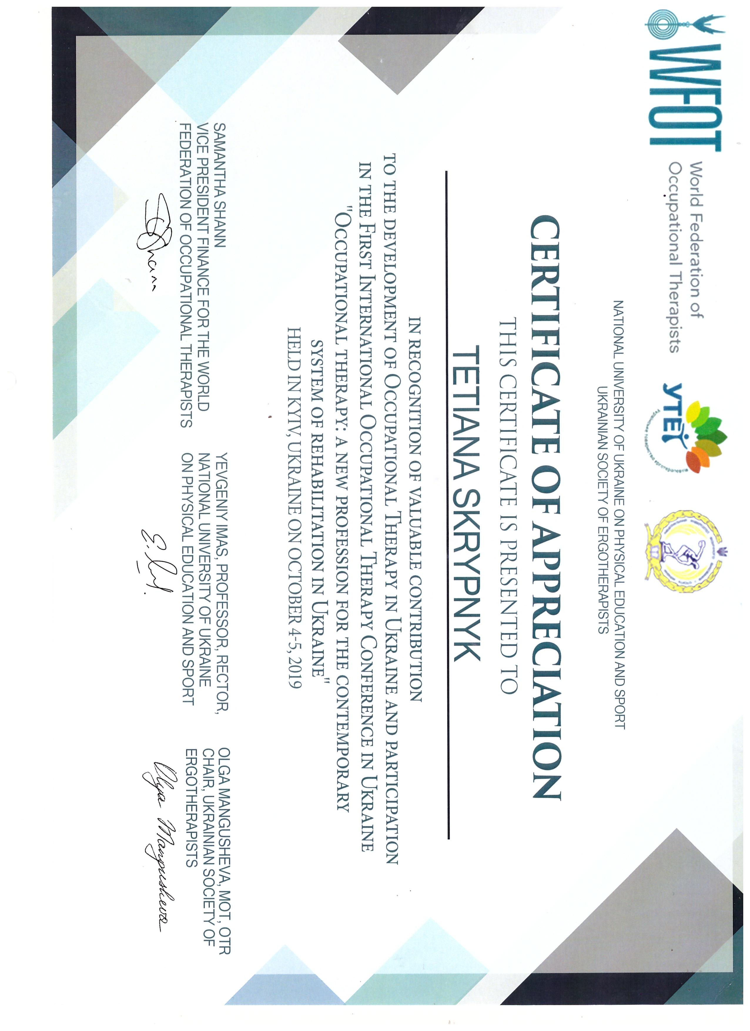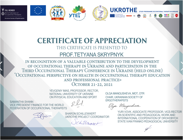 | 8274 | ІІІ Occupational Therapy Conference in Ukraine | Український досвід застосування «Сенсорної інтеграції» та «Сенсорної дієти» як методів з науково доведеною ефективністю | On-lane |