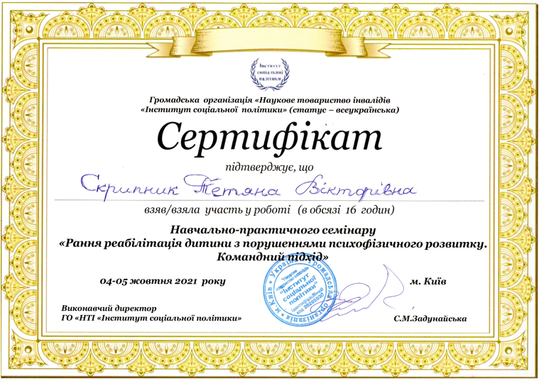 | 1212 | Командна робота в організації допомоги дітям з порушеннями психофізичного розвитку | Семінар | ВГО „Інститут соціальної політики” | 18.05.2017 00:00 | 2 |