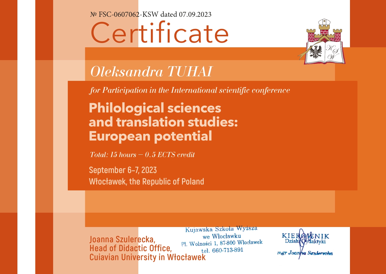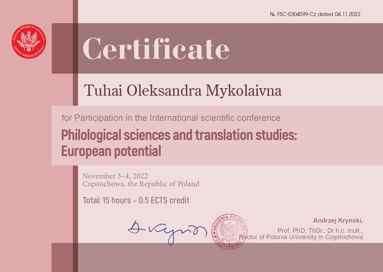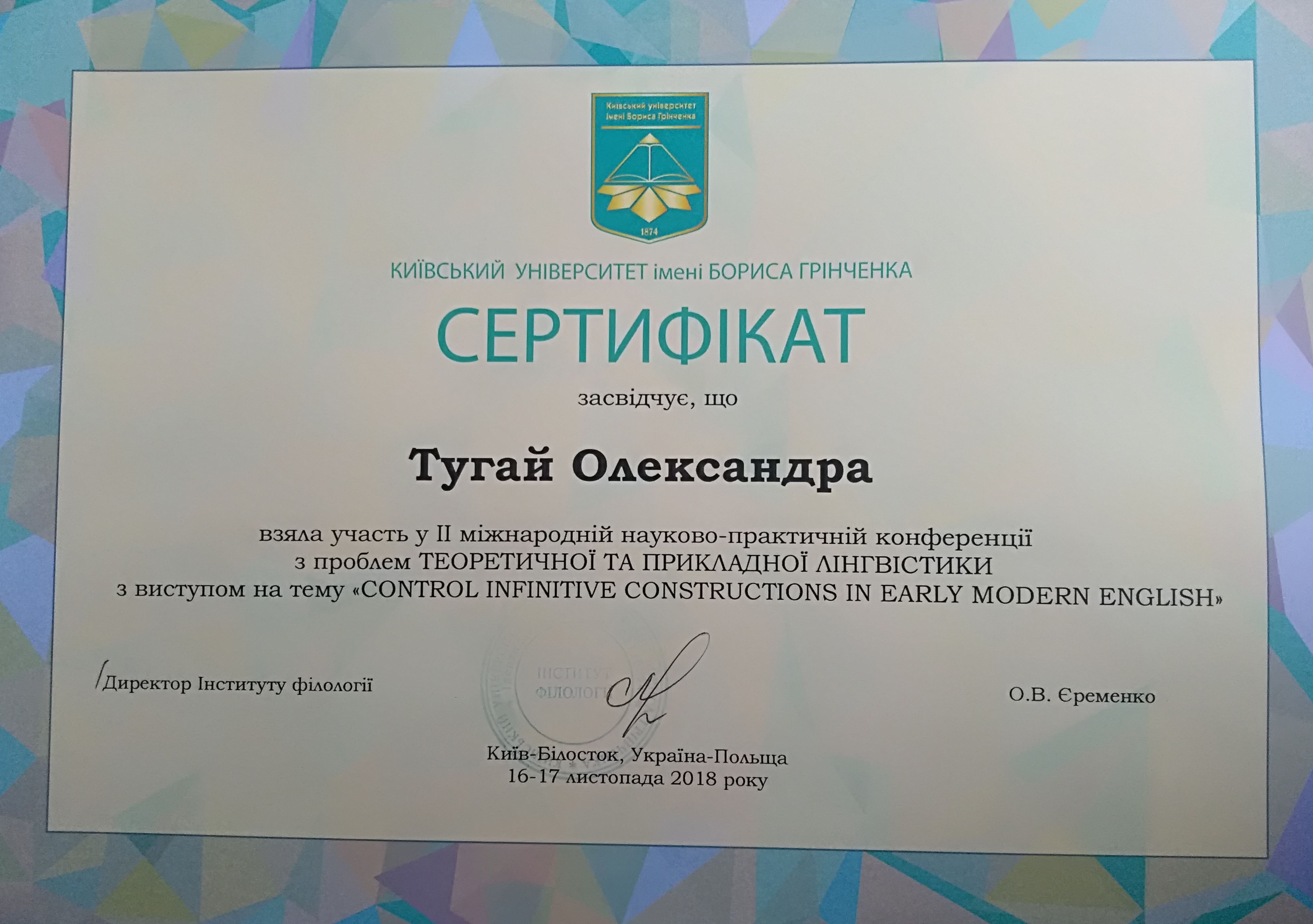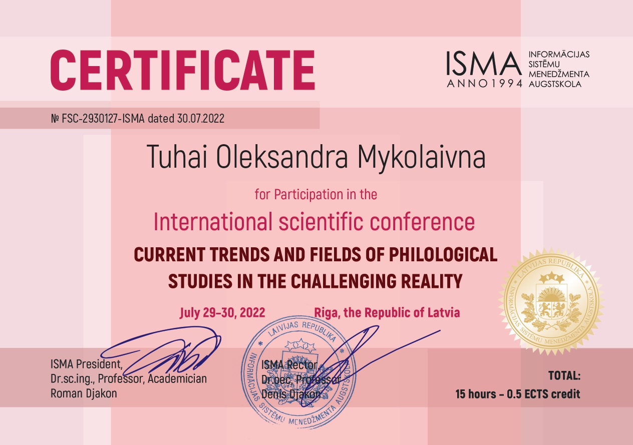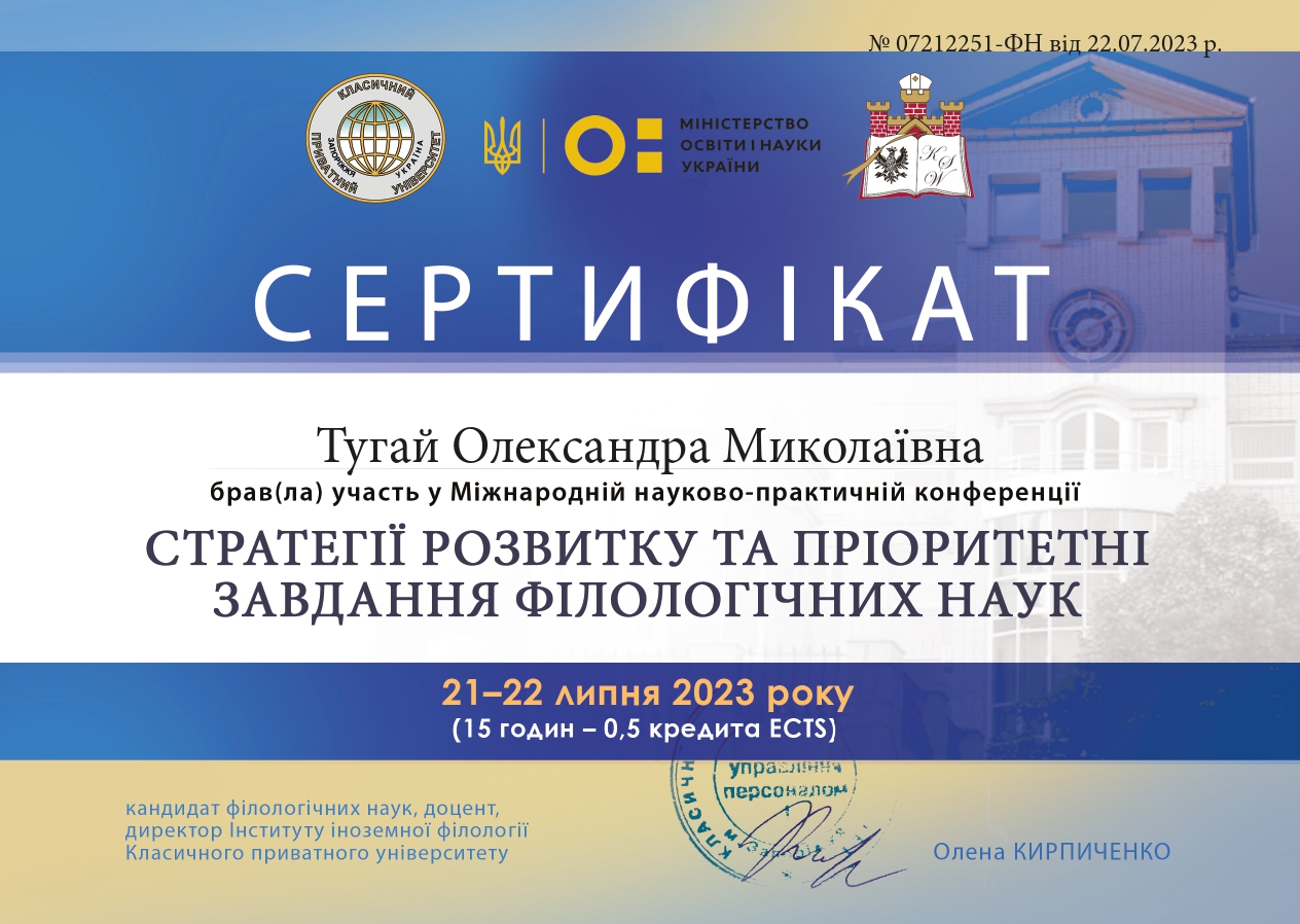 "Складне речення з дієсловами волевиявлення в ранньоновоанглійській мові: структурно-функціональний аспект" (спеціальність 035 Філологія, диплом ДР № 002502 від 28.10.2021).