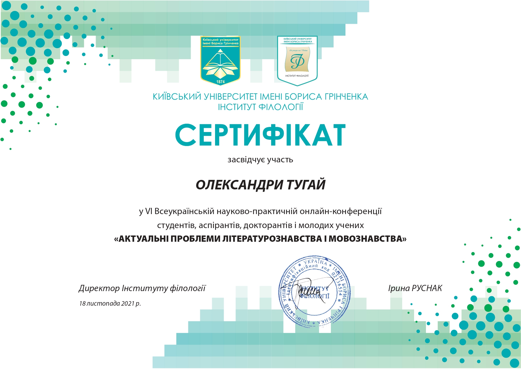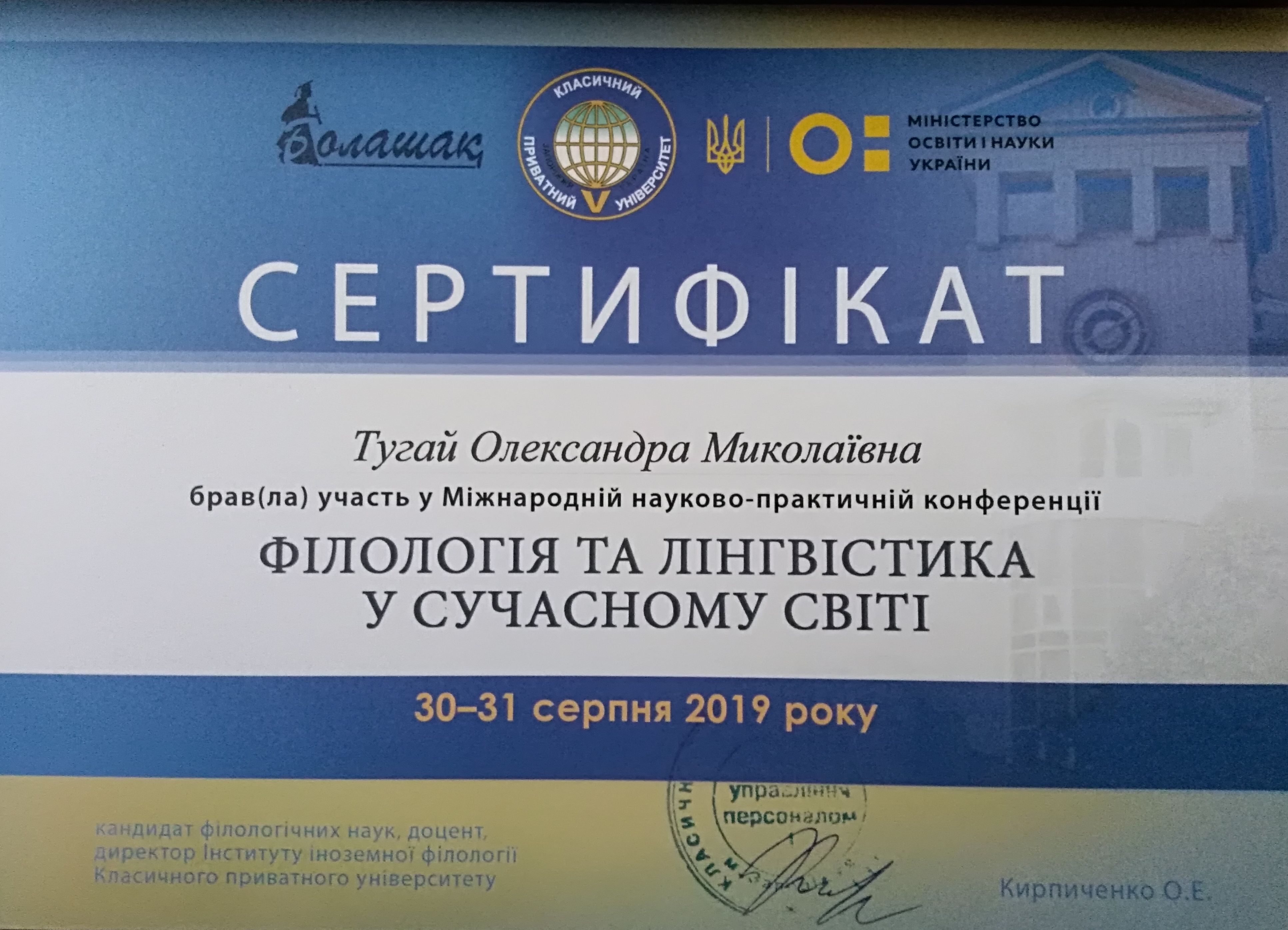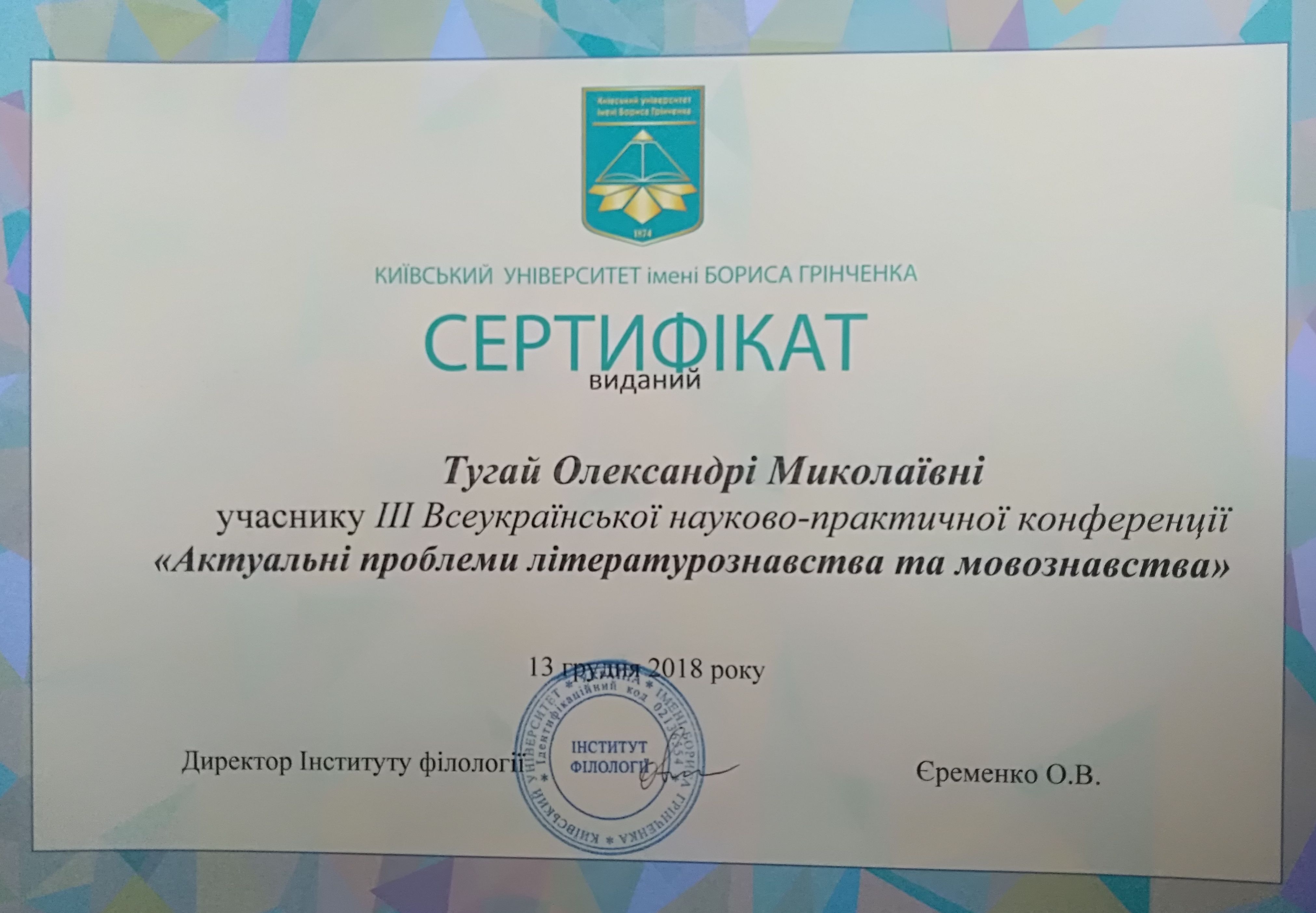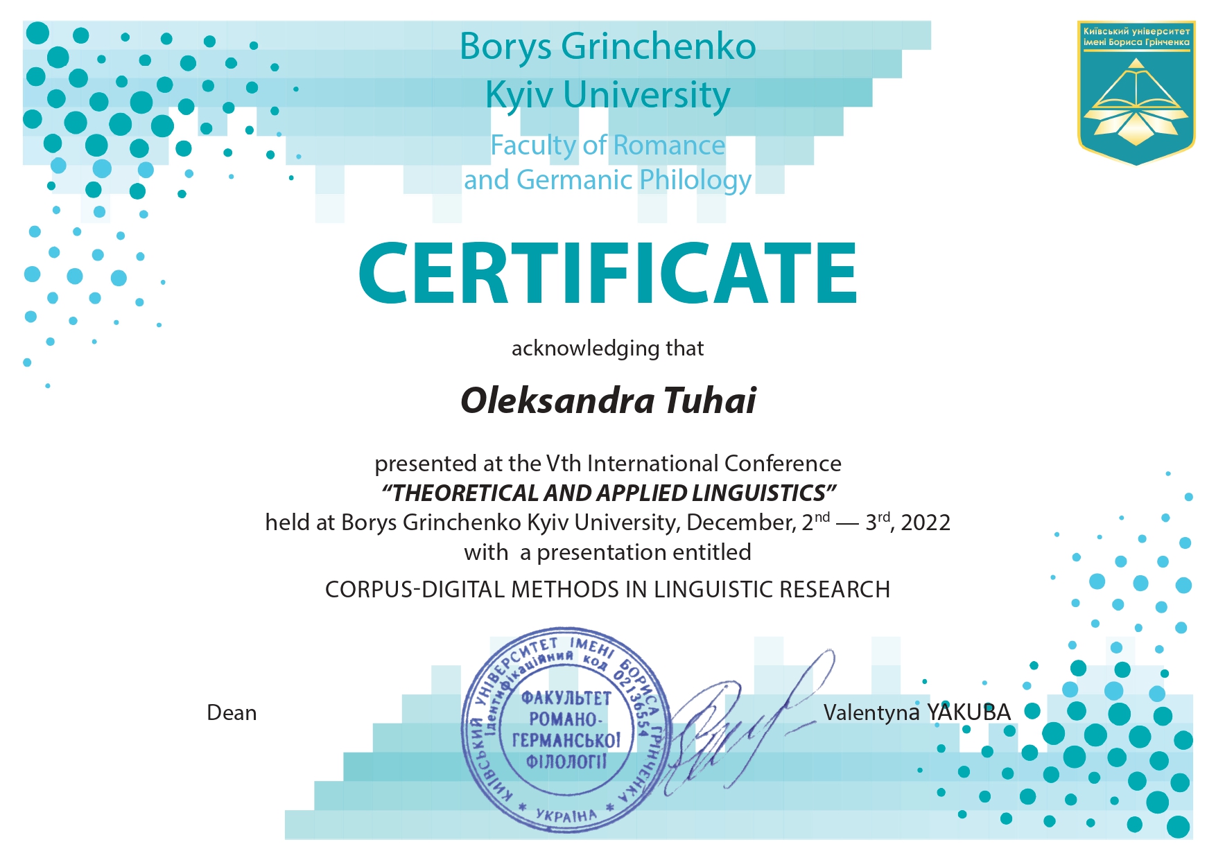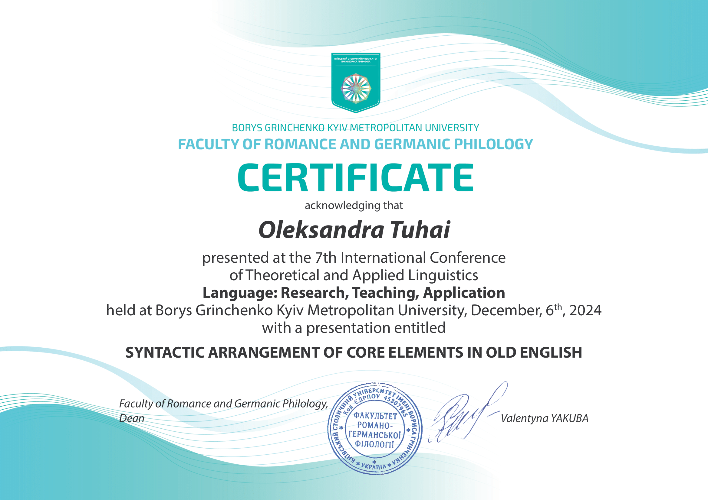 "Складне речення з дієсловами волевиявлення в ранньоновоанглійській мові: структурно-функціональний аспект" (спеціальність 035 Філологія, диплом ДР № 002502 від 28.10.2021).