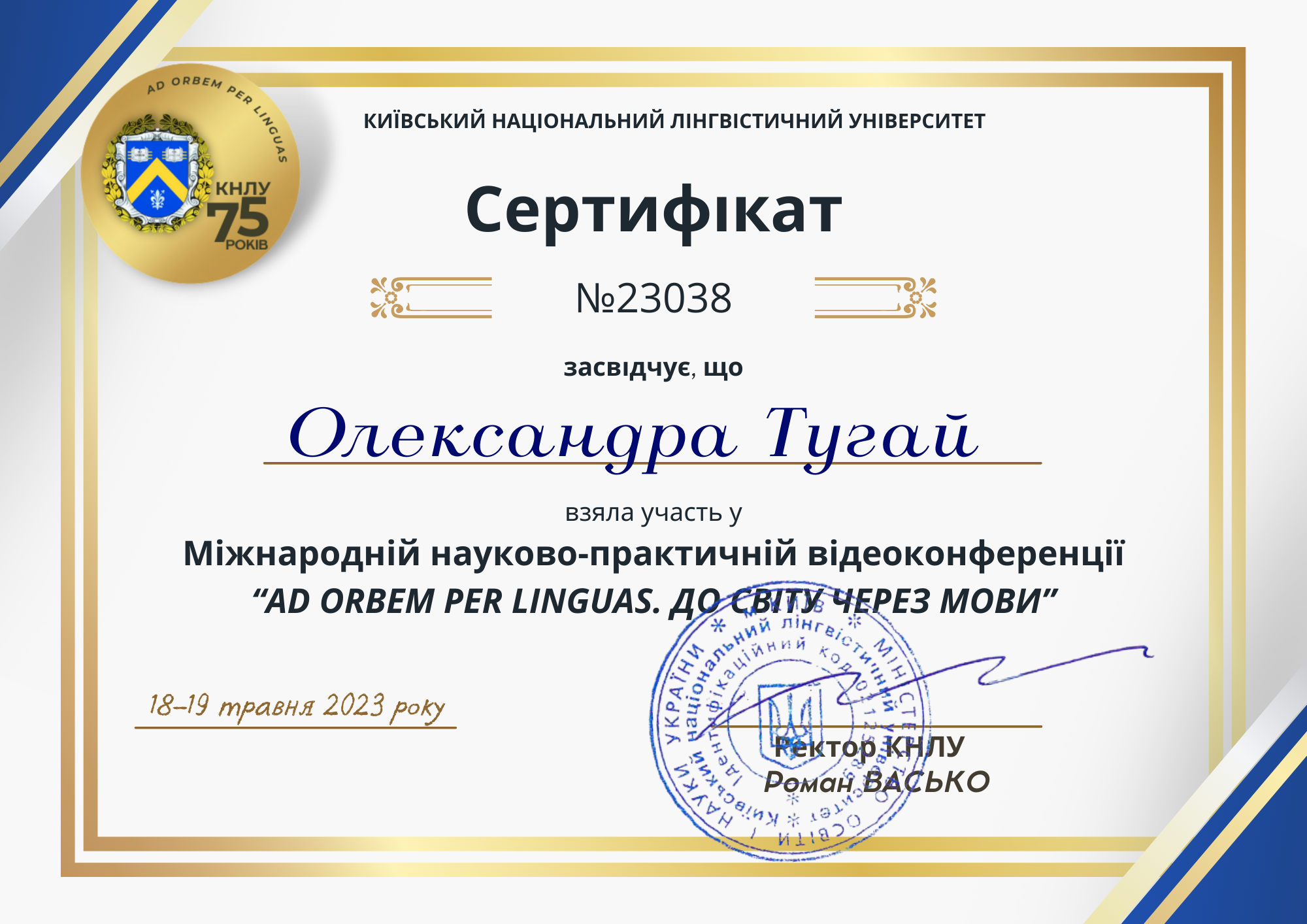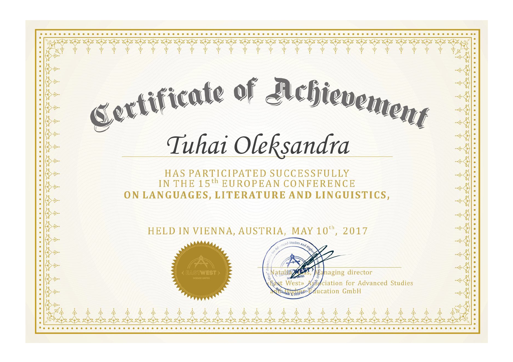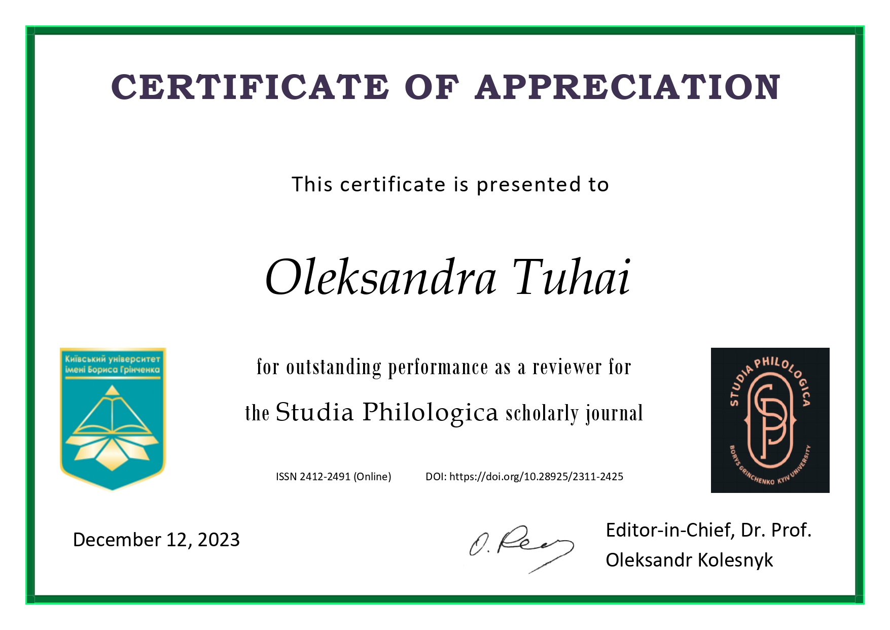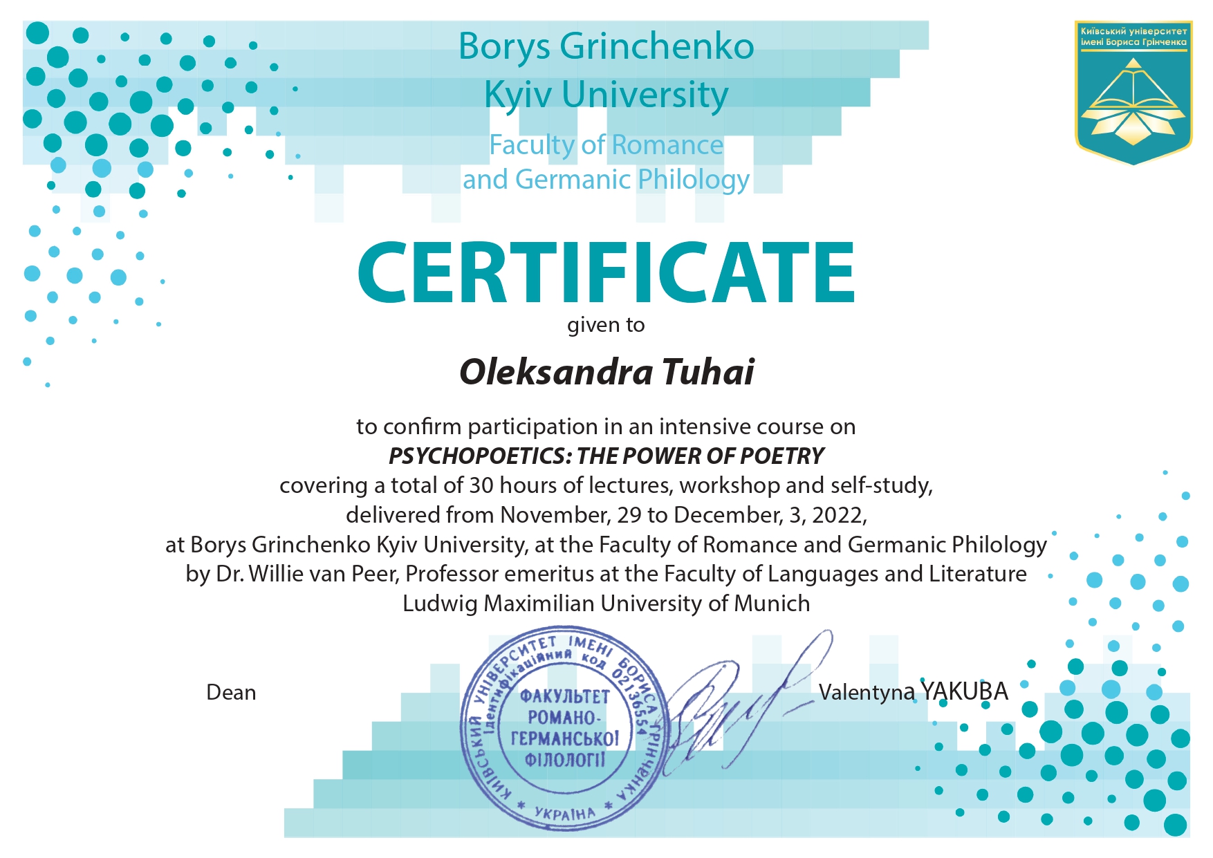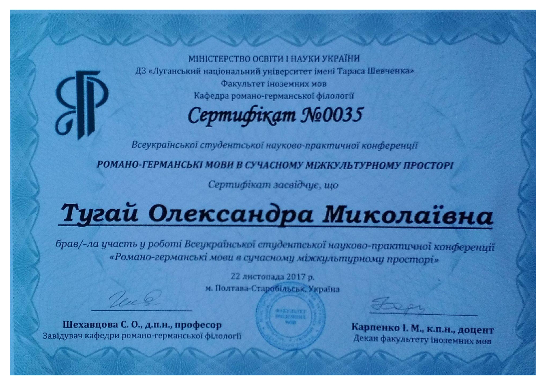 "Складне речення з дієсловами волевиявлення в ранньоновоанглійській мові: структурно-функціональний аспект" (спеціальність 035 Філологія, диплом ДР № 002502 від 28.10.2021).