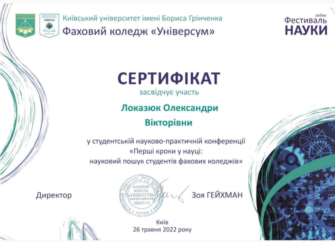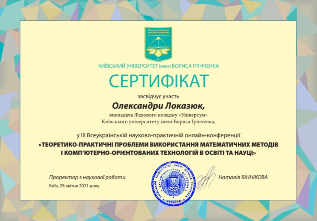 | 8125 | Перші кроки у науці: науковий пошук студентів фахових коледжів | Використання інтерактивних сервісів в освітньому процесі (Mozaik Education, MathDisk) | Фаховий коледж "Універсум" |