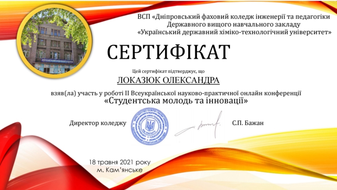 | 6857 | ІІ Всеукраїнська науково-практична онлайн конференція «Студентська молодь та інновації» | ЗАСТОСУВАННЯ НОВІТНІХ ЦИФРОВИХ ТЕХНОЛОГІЙ У СУЧАСНОМУ ОСВІТНЬОМУ ПРОСТОРІ | ВСП «Дніпровський фаховий коледж інженерії та педагогіки Державного вищого навчального закладу «Український державний хіміко-технологічний університет» |