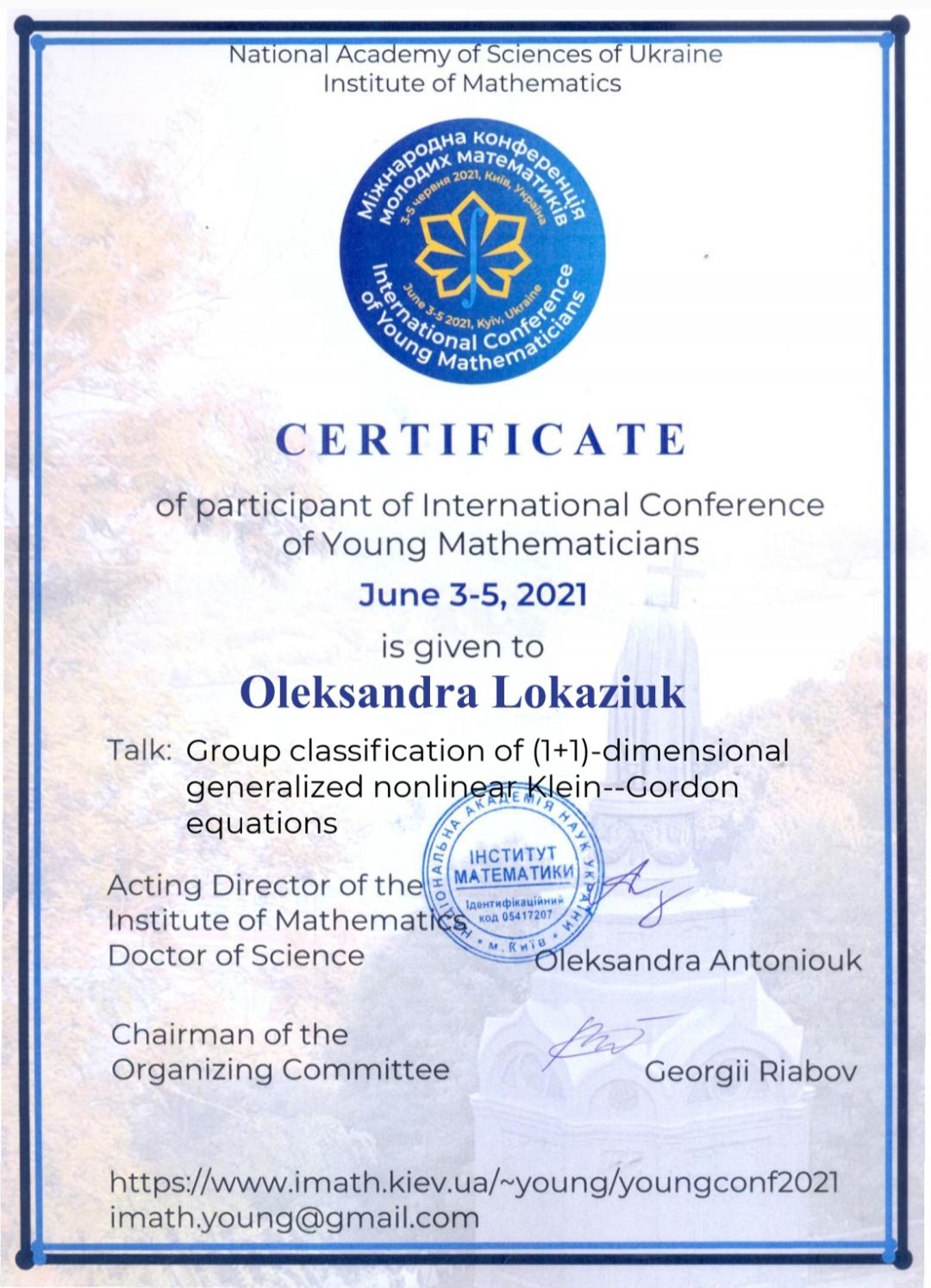 | 6887 | International Conference of Young Mathematicians | The group classification of (1+1)-dimensional generalized nonlinear\\ Klein--Gordon equations | Institute of Mathematics of NAS of Ukraine, Kyiv |