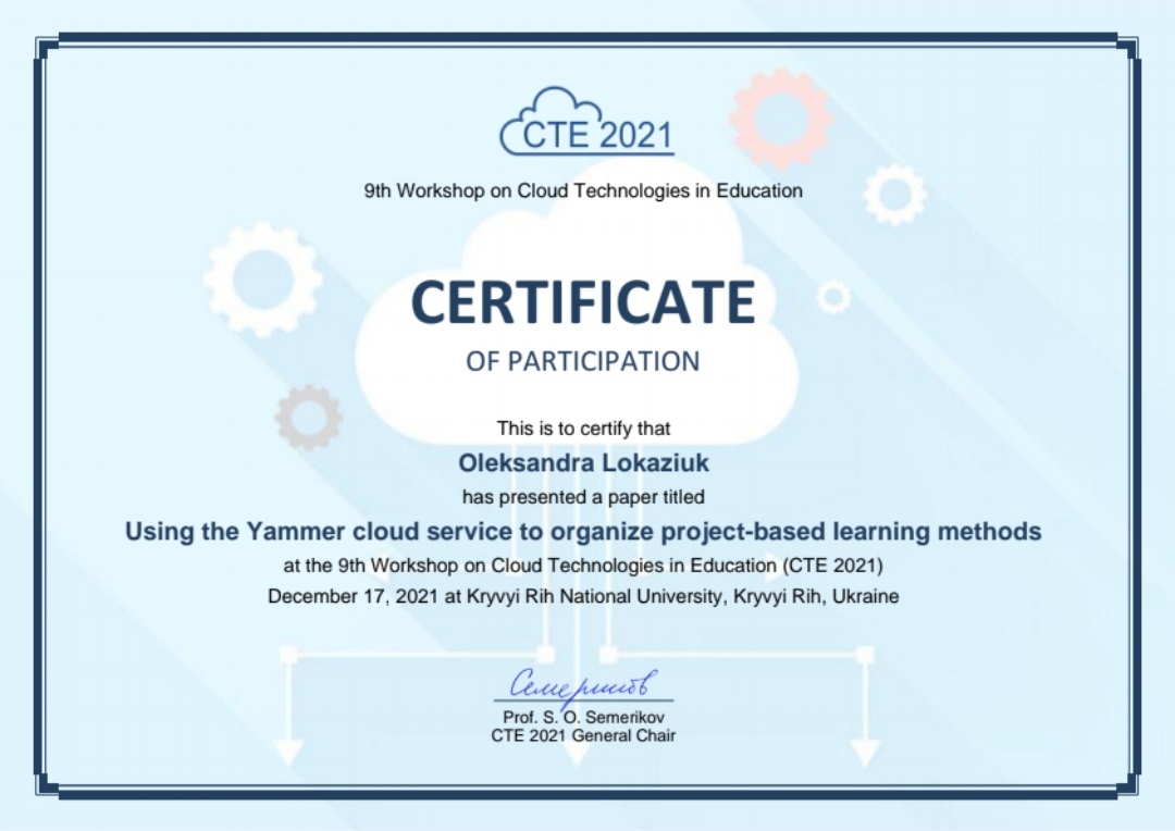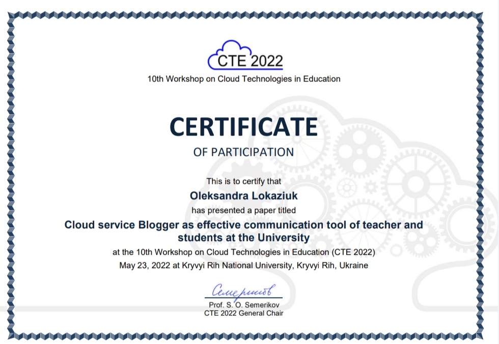 | 8124 | 10th Workshop on Cloud Technologies in Education (СТE 2022) | Cloud service Blogger as effective communication tool of teacher and students at the University | Криворізький державний педагогічний університет. |