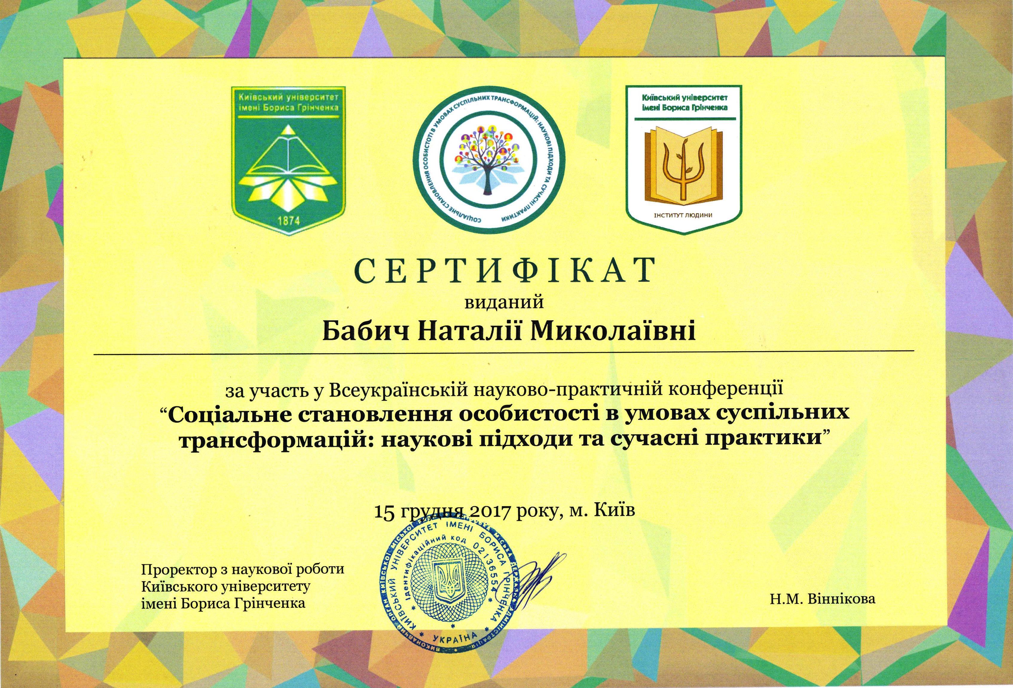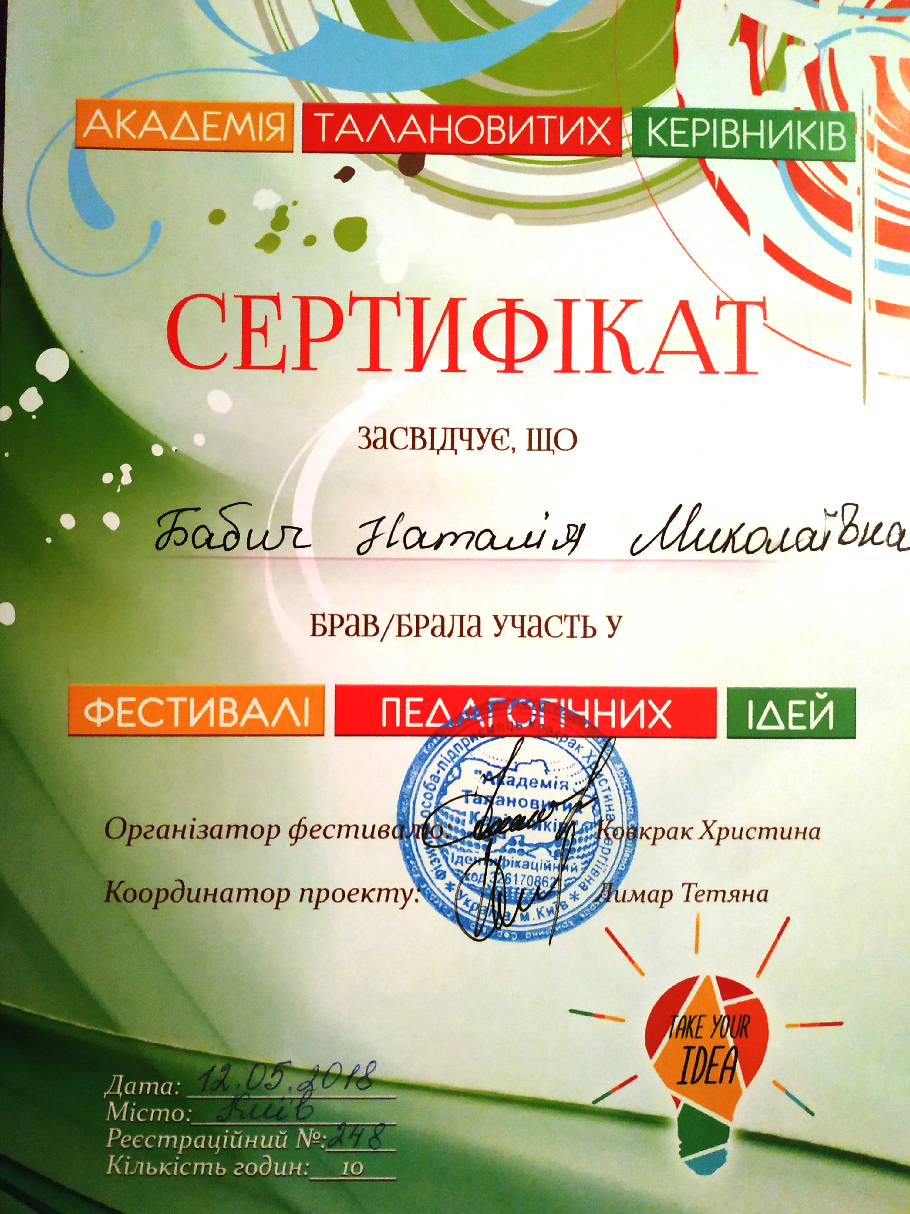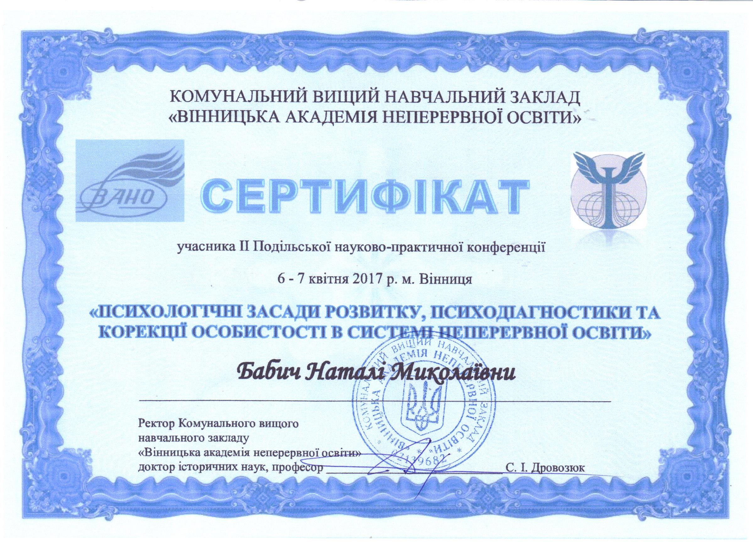 | 7261 | V Міжнародна науково-практична Інтернет-конференція "Актуальні проблеми формування творчої особистості педагога в контексті дошкільної та початкової освіти" | Участь у майстер-класах | м. Вінниця | document.pdf | |