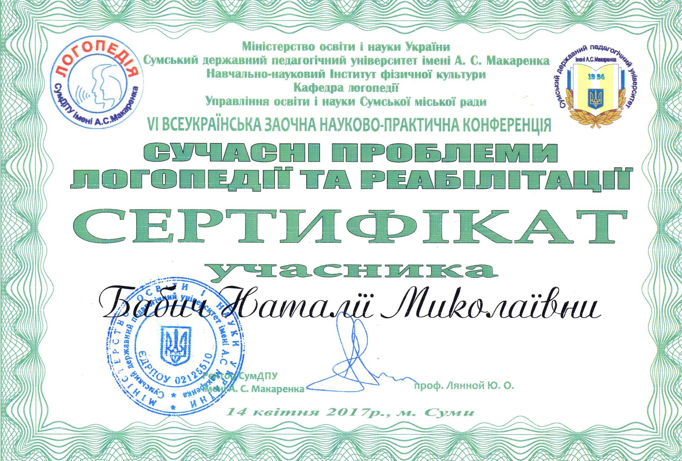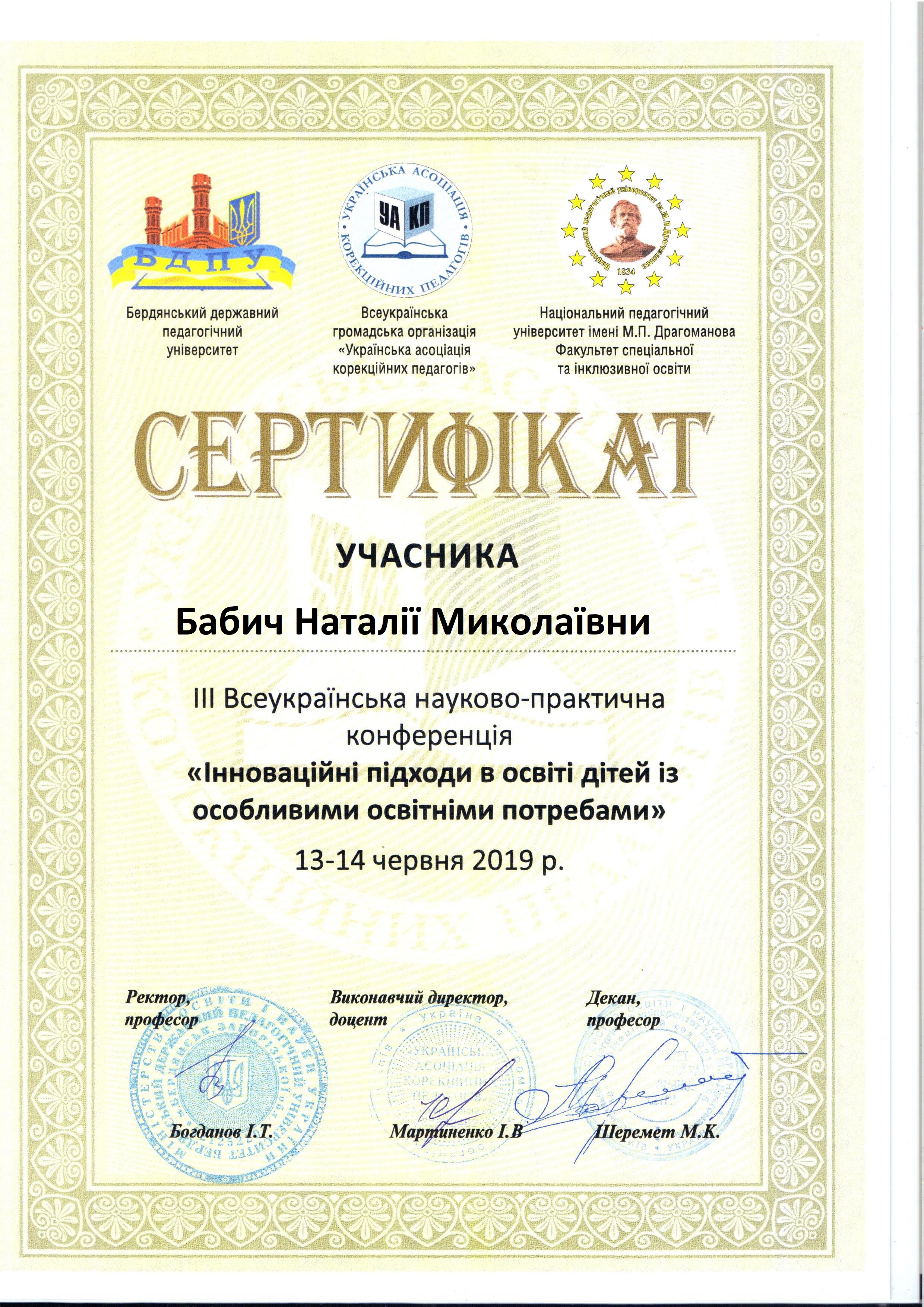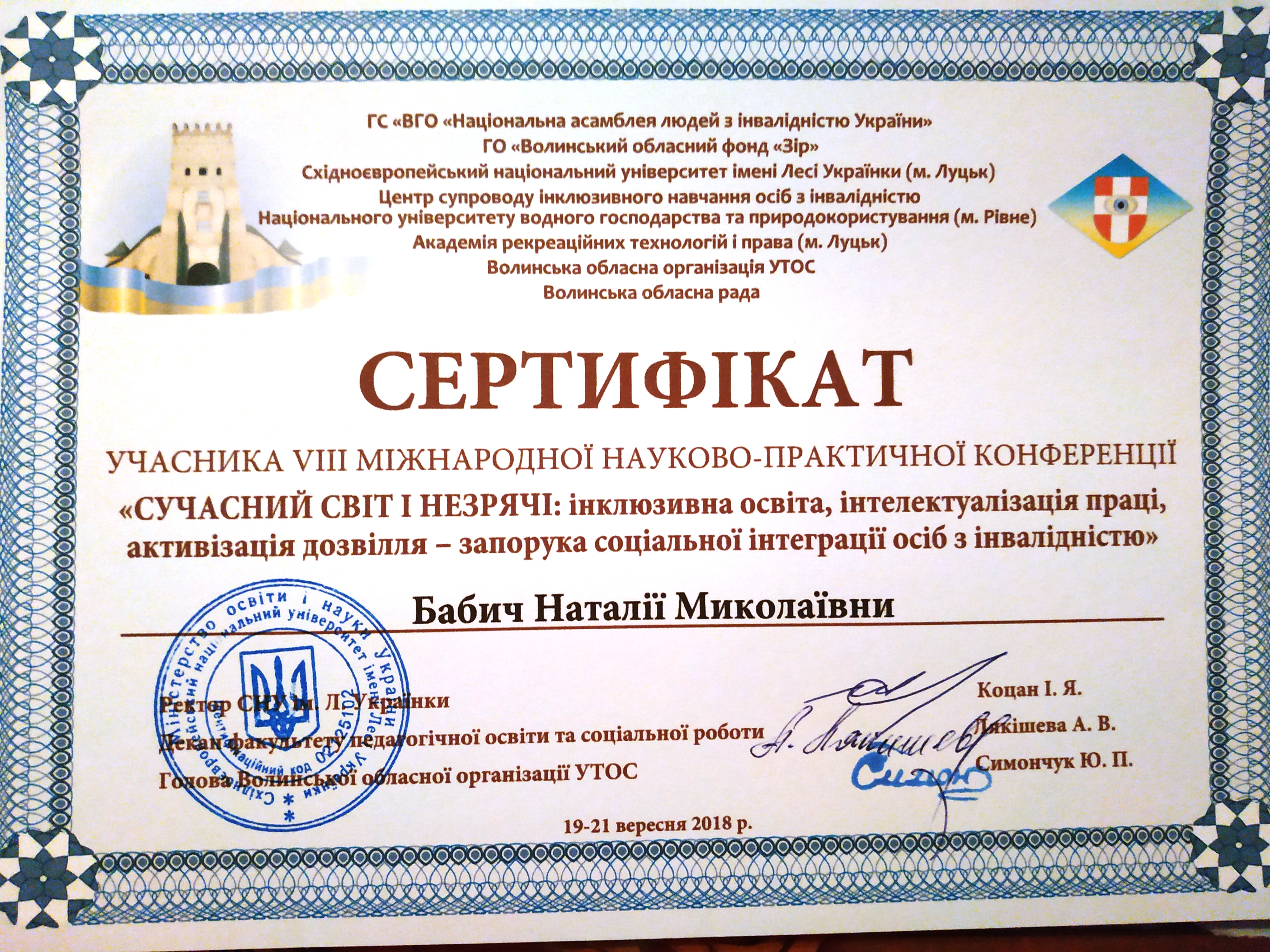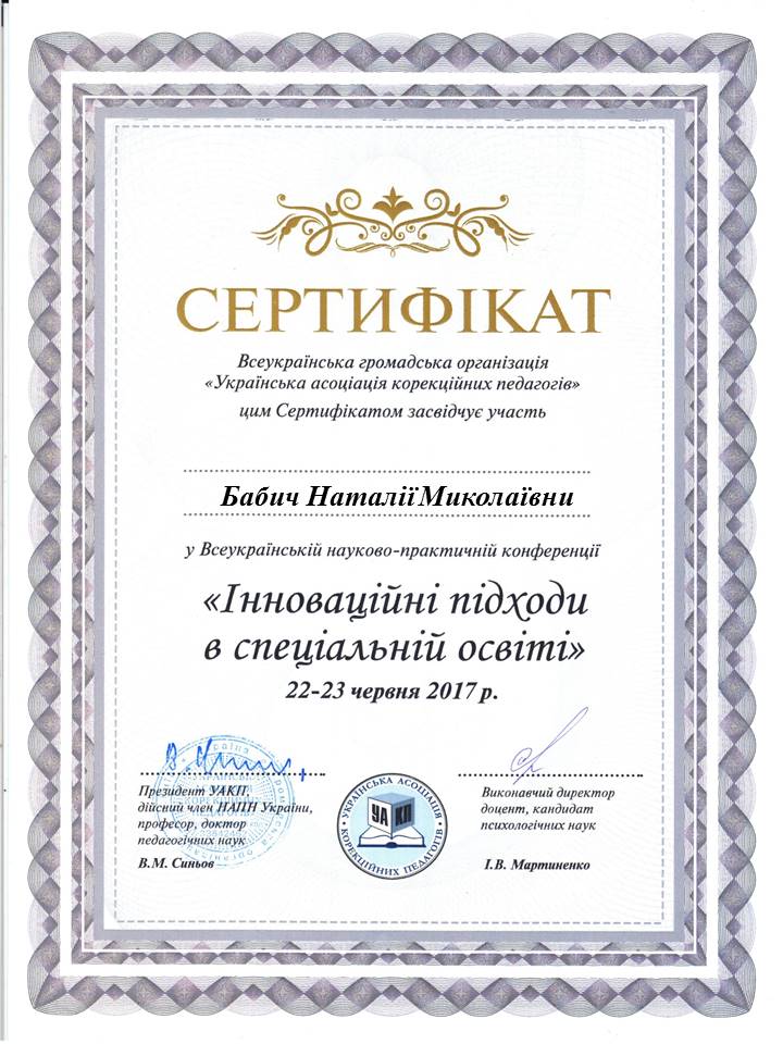 | 2530 | «Інноваційні підходи в спеціальній освіті» | Порушення складової структури мовлення у дітей з ТПМ | Всеукраїнська громадська організація «Українська асоціація корекційних педагогів», м. Київ |