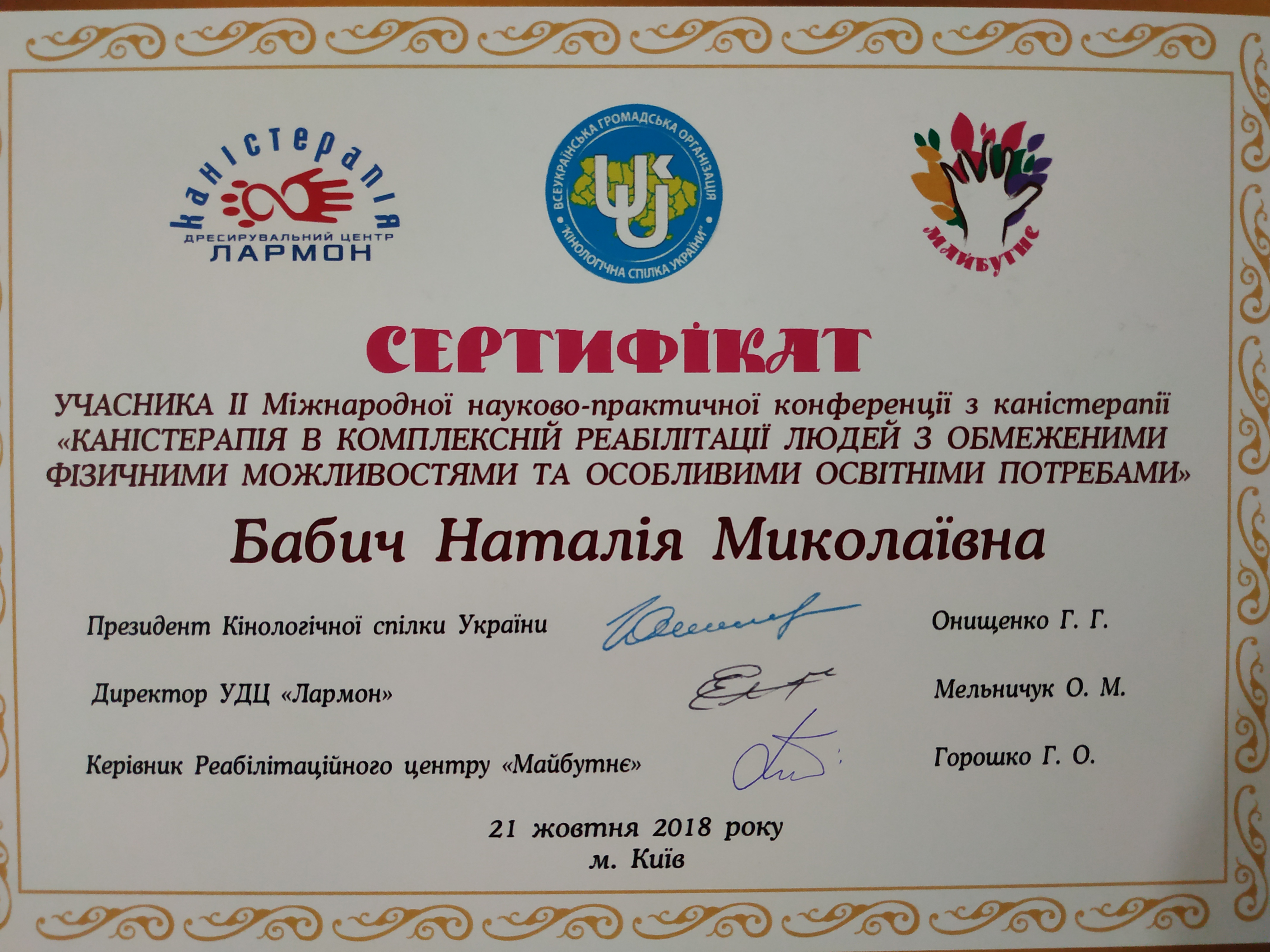 | 3973 | "Каністерапія в комплексній реабілітації людей з обмеженими фізичними можливостями та особливими освітніми потребами" | Участь у майстер-класах, круглому столі | м. Київ, Міжнародний Виставковий Центр |