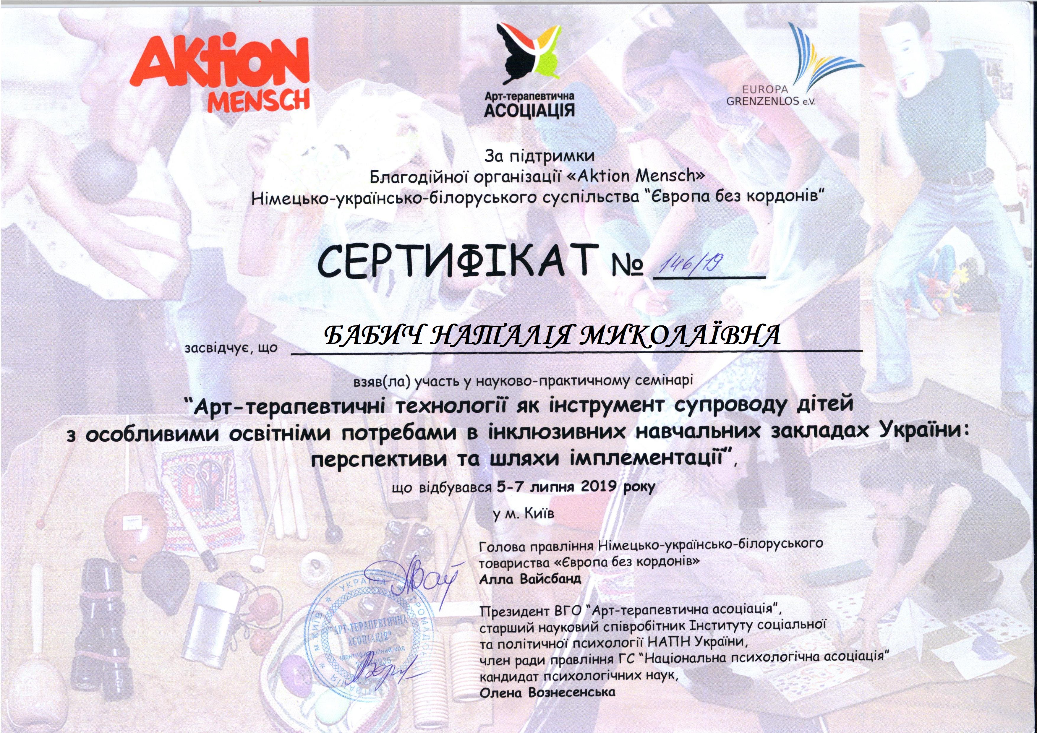 | 4894 | "Арт-терапевтичні технології як унструмент супроводу дітей з особливими потребами в інклюзивних навчальних закладах України: перспективи та шляхи імплементації" | Участь у майстер-класах/круглому столі | Ukrainian Global School, м.Київ |