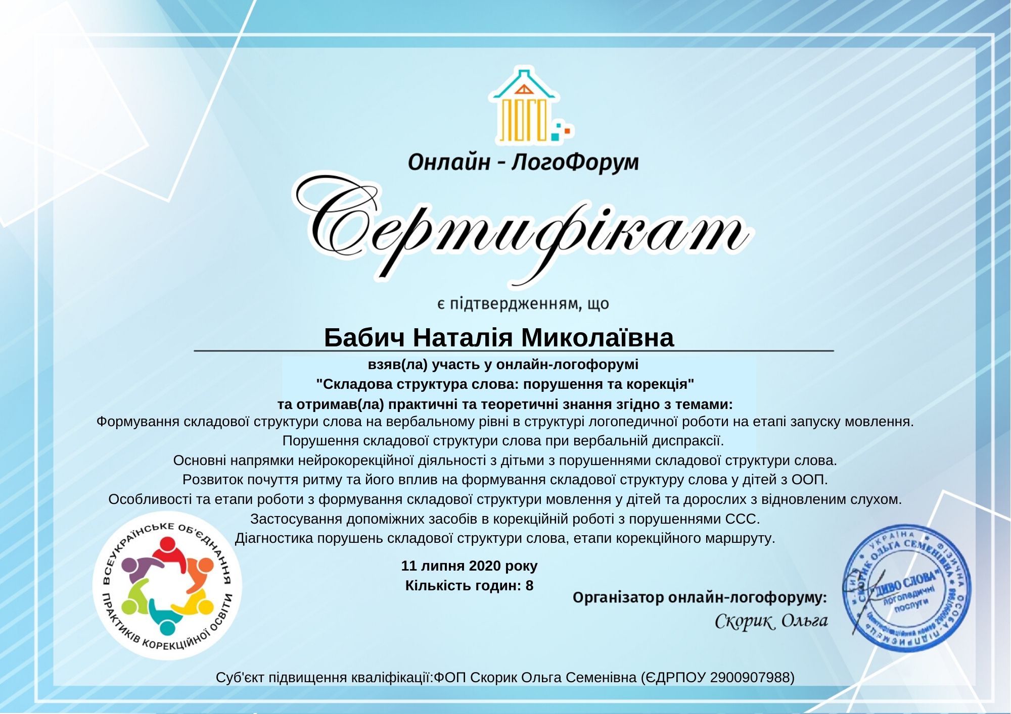 | 7264 | Міжнародному онлайн конгресі "VOICE and SPEECH: тенденції розвитку в XXI столітті" | Участь у тренінгах | Speech Therapy Center "LOGODAR" (Ukraine) | document.pdf | |