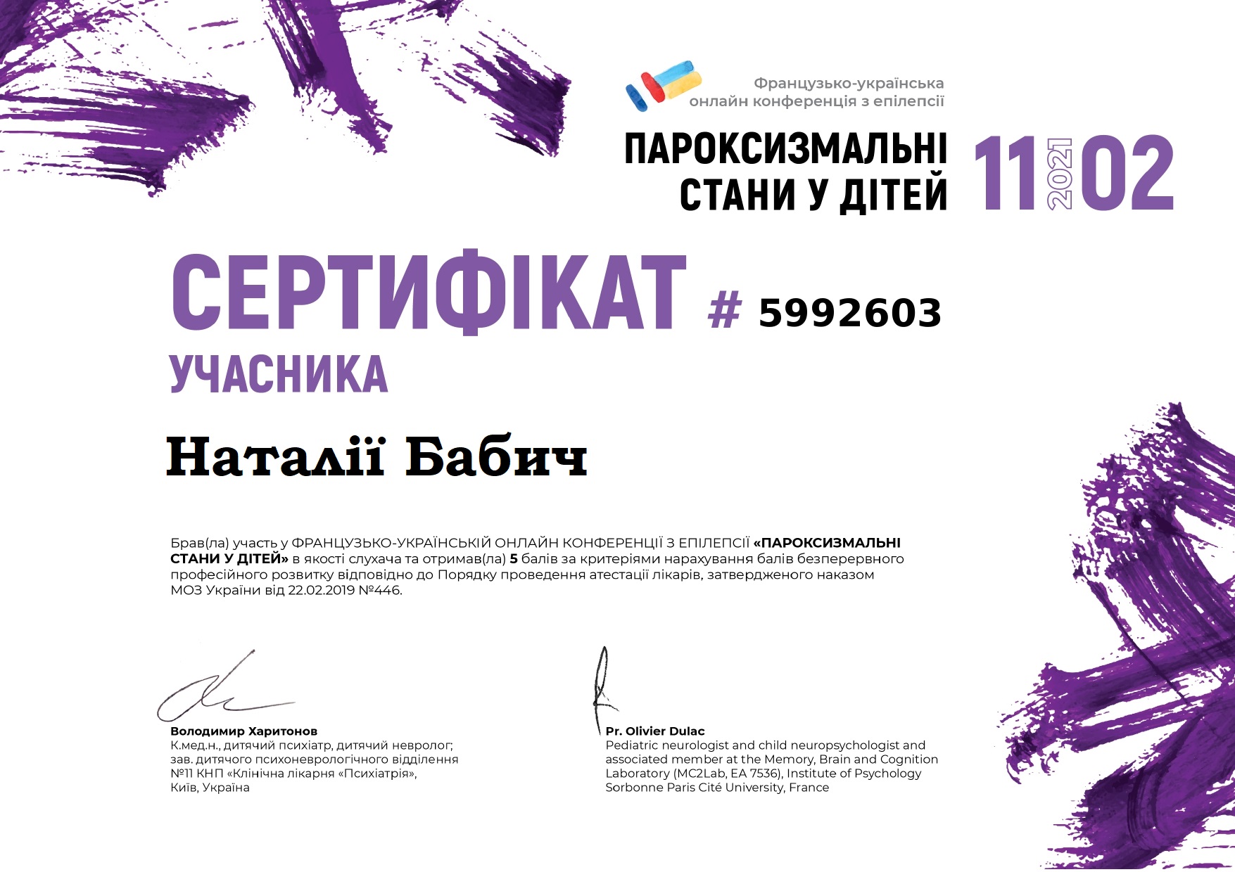 | 8966 | Науково-практична конференція "Епілепсія у дітей" | Участь у панельній дискусії | ОНЛАЙН | document.pdf | |